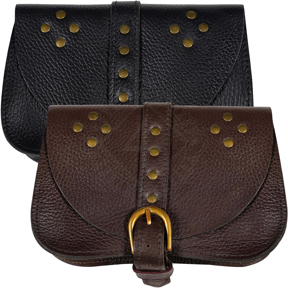 Die Tasche hat eine klassische Form mit abgerundeter Unterkante und einer markanten Klappe, die den Inhalt schützt. Sie ist aus robustem, strukturiertem Rindsleder gefertigt, das einen authentischen Eindruck vermittelt. Die Klappe wird sicher mit einem Lederriemen verschlossen, der durch eine stabile Metallschnalle in goldener Optik geführt wird. Sowohl die Klappe als auch der mittige Riemen sind mit Metallnieten verziert, die der Tasche einen rustikalen Charakter verleihen. Präzise Handarbeit garantiert Qualität und Langlebigkeit. Auf der Rückseite befinden sich typischerweise (obwohl nicht direkt sichtbar) Schlaufen zur einfachen Befestigung am Gürtel.