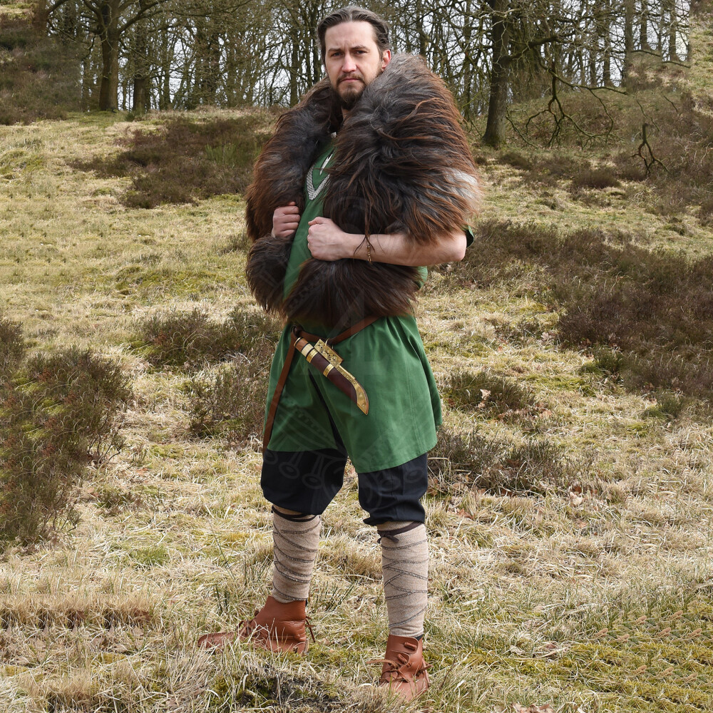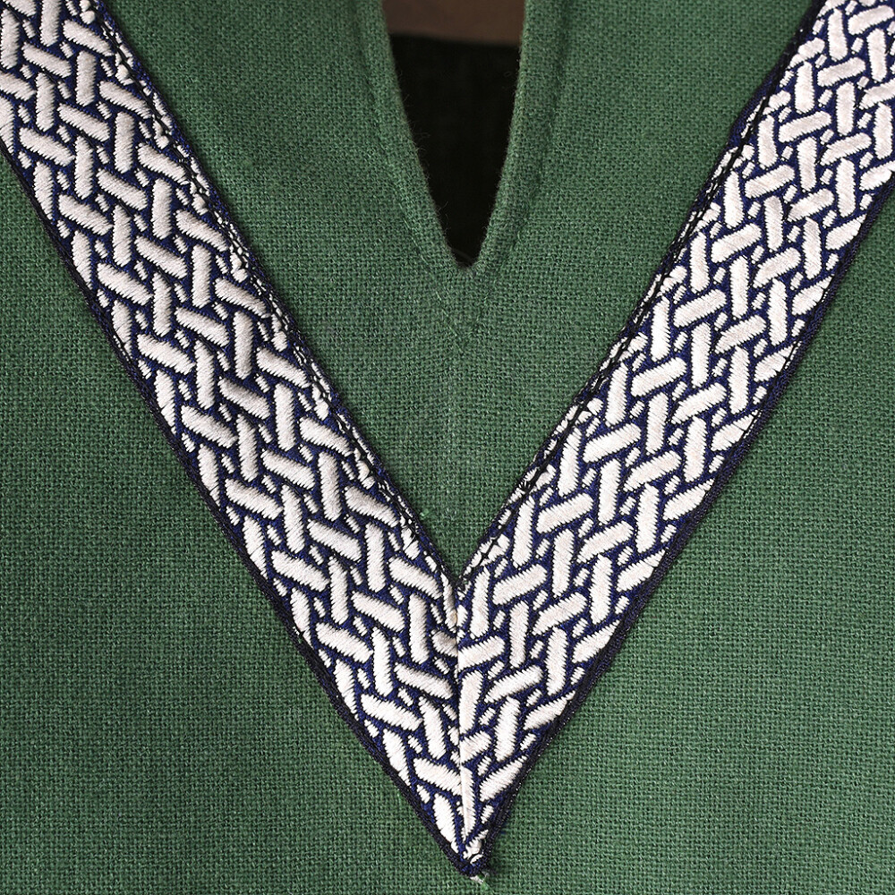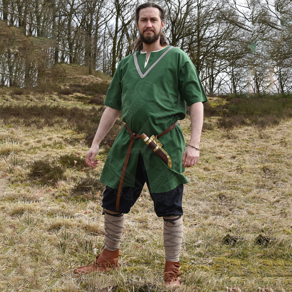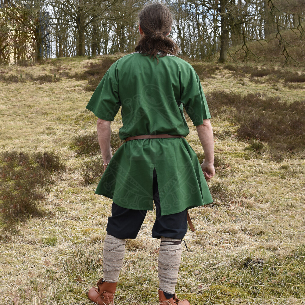 Diese Tunika eignet sich zur Darstellung vieler Nord- und Mitteleuropäischer Stämme zur Zeit der Völkerwanderung bis in das Hochmittelalter. Sie ist aus Baumwollstoff gefertigt und mit einer applizierten Borte versehen. Das Muster der Borte ist angelehnt an den Fund B23 aus Birka und stellt ein Flechtmuster dar. Der Rundhalsausschnitt ist in der vorderen Mitte geschlitzt und wird je nach Belieben offen getragen oder mit einer Fibel geschlossen. An den Seitennähten sind ab der Hüfte sog. Geren (Keile) eingesetzt. Die vordere und die hintere Mitte sind am Saum mit einem Schlitz versehen, so dass man die Tunika auch zum Reiten tragen kann. Für einen authentischen Look empfehlen wir die Tunika mit einem Ledergürtel zu tragen. Weitere Produktinformationen ...
