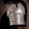 Die Basis dieser Schulterplatten bildet eine große obere Platte, die das Schultergelenk schützt, gefolgt von vier kleineren Lamellen, die den Oberarm bedecken. Alle Teile sind so miteinander vernietet, dass sie geschmeidig übereinander gleiten (artikulieren). * Material: Verwendet wird Baustahl mit einer Stärke von ca. 1,6 mm (16 Gauge). Das ist eine ausreichende Dicke für die meisten Schlachtfeld-Szenarien, die Hieb- und Schlagwirkungen widersteht, ohne dass die Rüstung zu schwer wird. * Form: Der untere Rand der Lamellen ist leicht spitz zulaufend, was auf den gotischen Stil des späten 15. Jahrhunderts verweist. * Oberfläche: Die polierte Oberfläche sieht nicht nur gut aus, sondern lässt auch Rost schlechter haften und erleichtert die Pflege.