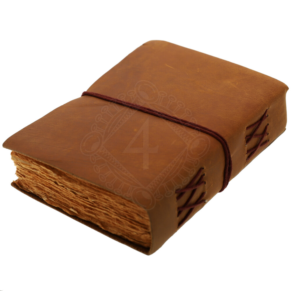 Natürliche Leinenschnur, die um das Notizbuch gewickelt ist. Die patinierte Oberfläche der Ledereinbände sowie das Papier im Inneren des Notizbuchs vermitteln einen antiken Eindruck.