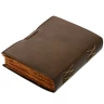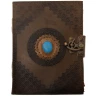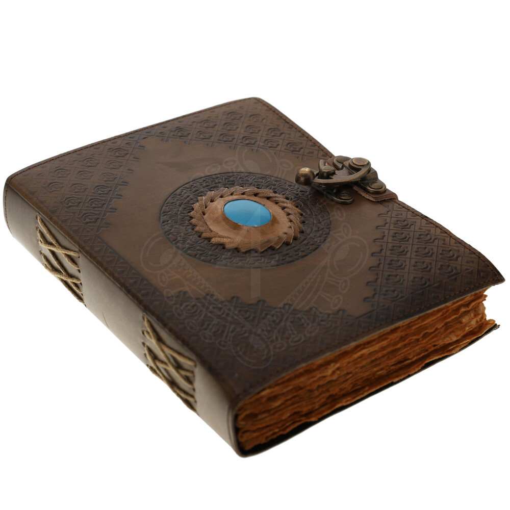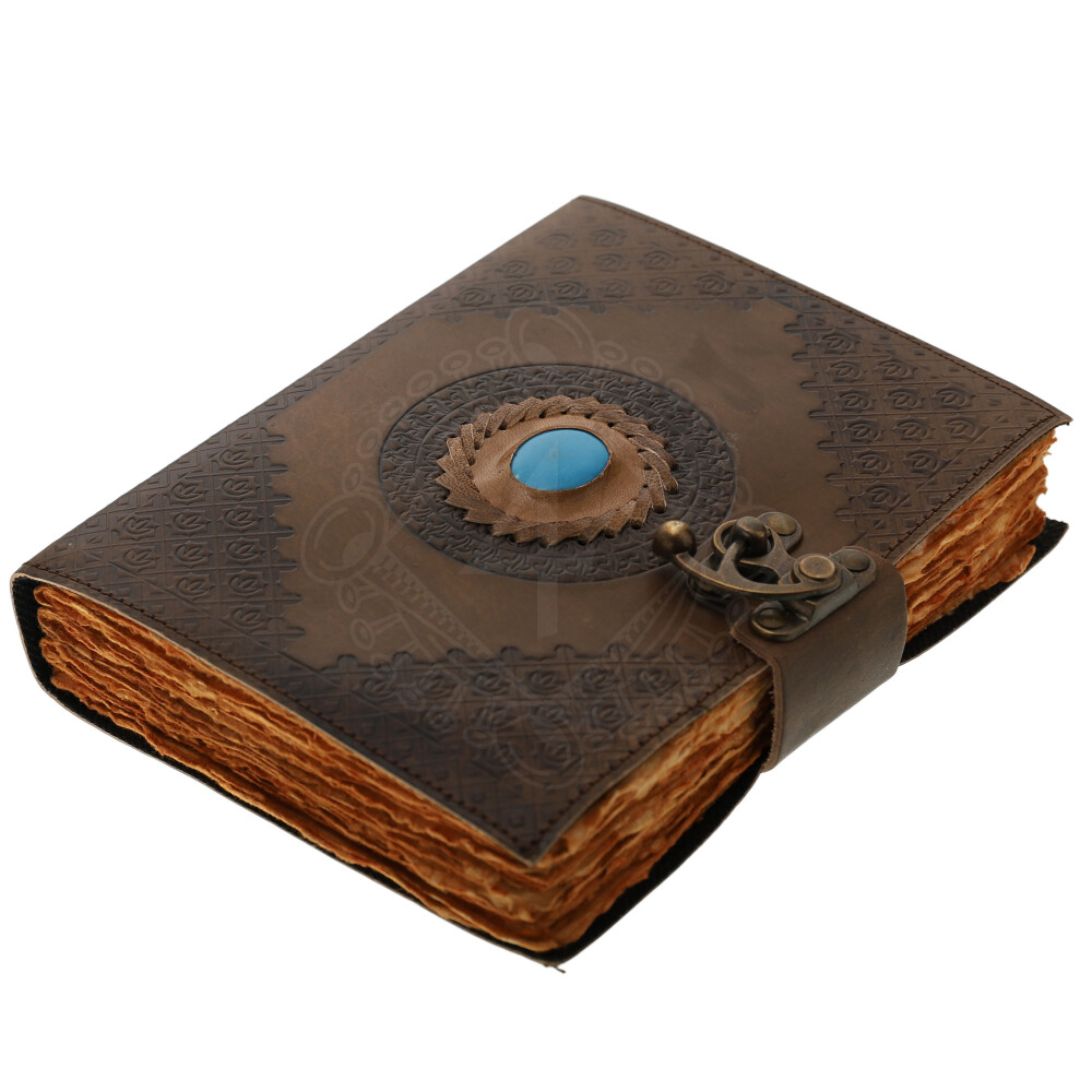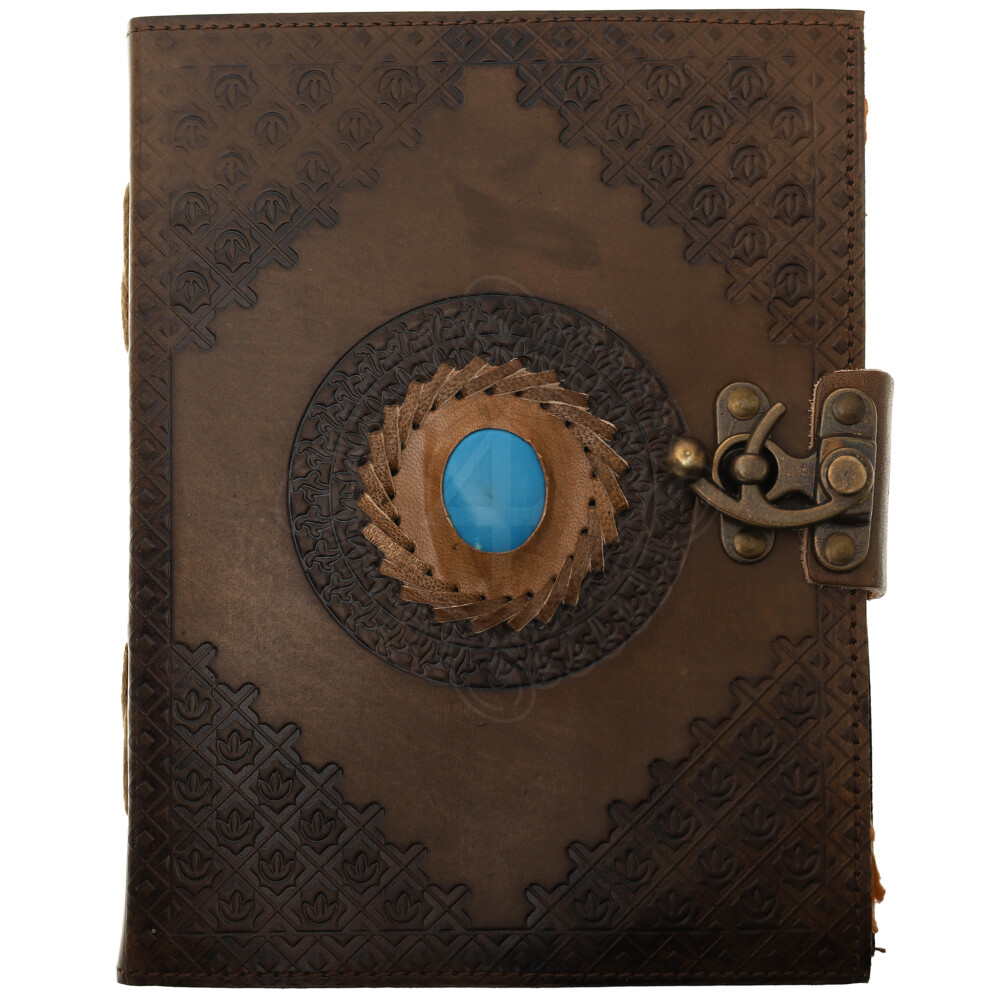 Leder Notizbuch mit geprägten Pflanzenornamenten und einem blauen Naturstein