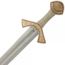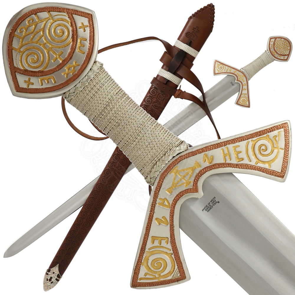 Diese originalgetreue Nachbildung ist ein voll funktionsfähiges Schwert mit einer Klinge aus Kohlenstoffstahl, die genauso kampffähig ist wie das Original. Der Knauf und die Parierstange sind aus versilbertem Stahl und die eingravierten Symbole und Buchstaben sind mit echtem Gold und Kupfer überzogen. Wir haben den Griff für einen besseren Halt verlängert. Die Drahtumwicklung des Griffs hat das gleiche Muster wie beim Original, das vor vielen Jahrhunderten von der Hand eines prominenten Wikingerkriegers gehalten wurde.