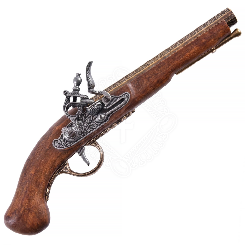 Reisen Sie zurück in das Zeitalter der Aufklärung, als Schusswaffen nicht nur Kriegswerkzeuge, sondern auch Symbole für handwerkliches Geschick und sozialen Status waren. Diese detailgetreue Nachbildung einer französischen Steinschlosspistole, deren Original 1781 in Paris gefertigt wurde, besticht durch ihre Eleganz und historische Genauigkeit. Sie ist die ideale Wahl für Geschichtsliebhaber, Sammler und Reenactment-Darsteller der napoleonischen Ära oder des Barocks. Obwohl die Pistole nicht schussfähig ist, bleibt die Mechanik voll beweglich, was ein authentisches Handhabungserlebnis ermöglicht. Ergänzen Sie Ihr historisches Kostüm oder Ihre Sammlung um dieses edle Stück, das den Geist des vorrevolutionären Frankreichs in sich trägt. Weitere Produktinformationen ...