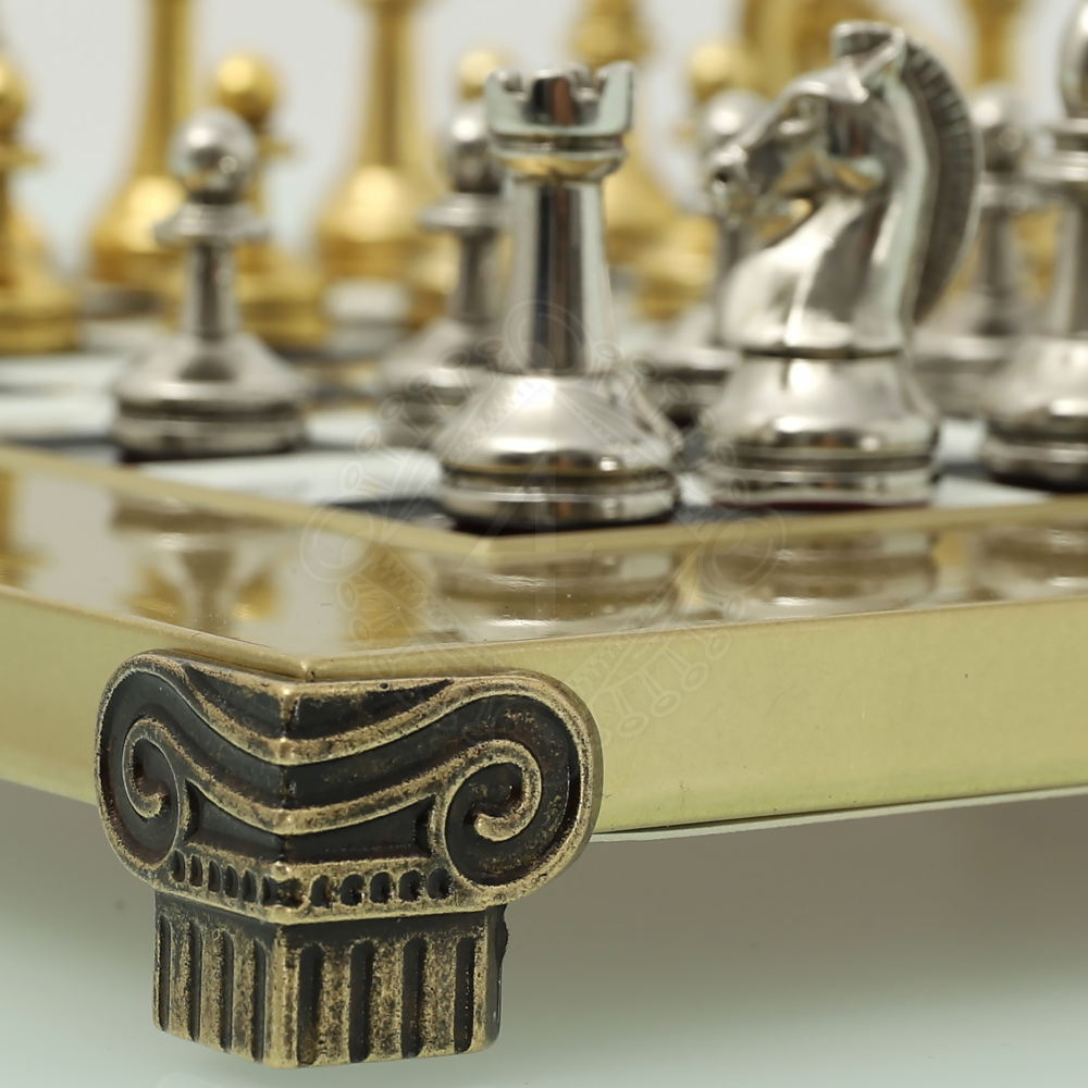 Staunton-Schachfiguren gelten als traditionell. Wir kennen und lieben sie als solche. Diese klassischen Schachfiguren sind nach Howard Staunton benannt, der weithin als einer der besten Spieler der Welt galt. Der Springer, die komplizierteste und markanteste Figur eines jeden Schachspiels, ist ein realistisch geschnitzter Springerkopf. Das Staunton-Springer wurde wahrscheinlich von der Skulptur am Ostgiebel des Parthenon inspiriert. Das Staunton-Metallschachspiel von Manopoulos unterstreicht diese architektonische Geschichte der Originalfigur und respektiert gleichzeitig ihr zeitloses Design.