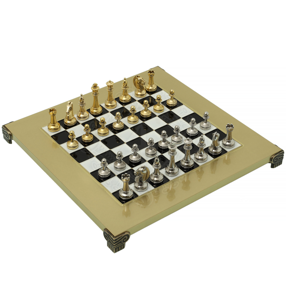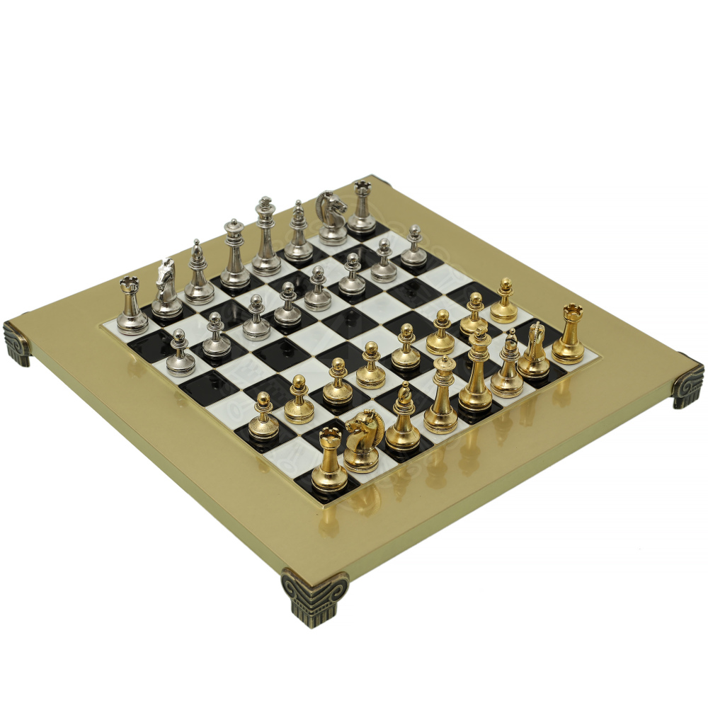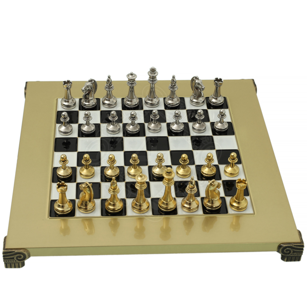 Schachspiel mit Gold/Silber Metallfiguren Staunton und Schachbrett aus Messing 28x28cm