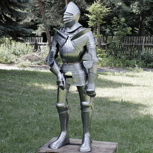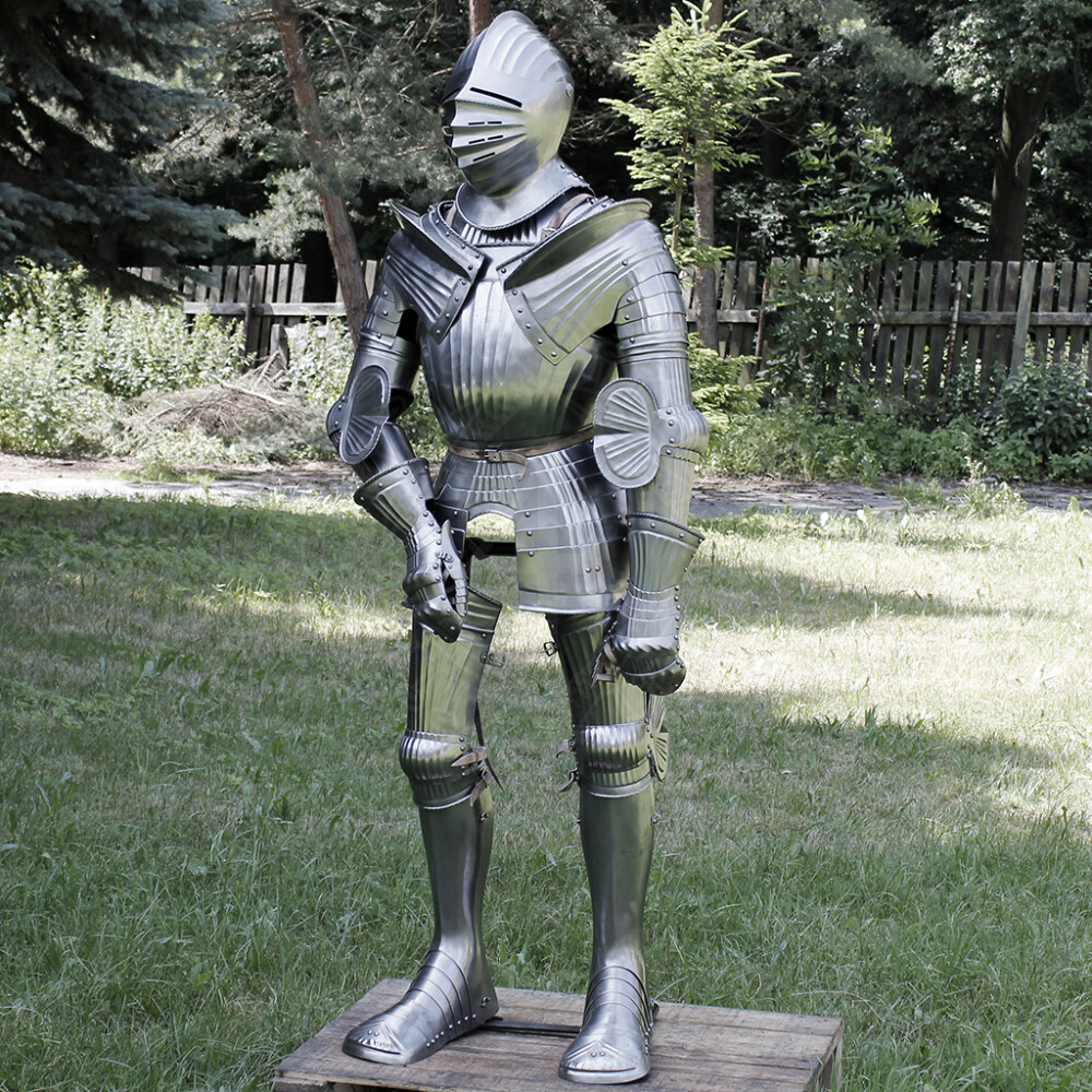 Maximilianrüstungen waren typisch für höhere Ränge der Landsknechten-Offiziere. Unsere fabelhafte Repliken erfassen perfekt die Formen der berühmten Originalwerke mit vielen Qualitätsdetails. Das Kunstwerk aus Stahl ist bedecken herrlich die harmonisch arrangierten Riffeln. Diese Rüstung ist geeignet nicht nur als Dekoration, sondern auch als wirkliche Ausrüstung der Schaukämpfer. Sie ist voll funktionsfähig wie das in der Geschichte war. Es handelt sich um ein Meisterwerk, auf das sein dessen Besitzer stolz seien kann!