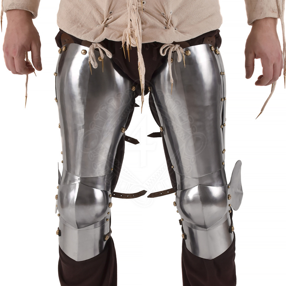 Suchst du nach dem perfekten Kompromiss zwischen Schutz und Beweglichkeit für dein historisches Kostüm oder LARP? Wir präsentieren dir eine wunderschön gefertigte Replik einer spätmittelalterlichen Plattenrüstung, die Oberschenkel, Knie und den oberen Teil der Schienbeine schützt. Diese Rüstung besticht auf den ersten Blick durch ihre glänzende Oberfläche und die präzisen Messingnieten, von denen einige meisterhaft in Blumenform gefeilt sind. Die anatomische Formgebung und das System der beweglichen Schieben garantieren dir hohen Tragekomfort bei der Bewegung auf dem Schlachtfeld und im Lager. Mit einer Stahlstärke von 1,8 mm erhältst du einen zuverlässigen Schutz für leichten Schaukampf und ein unvergessliches Aussehen. Weitere Produktinformationen ...