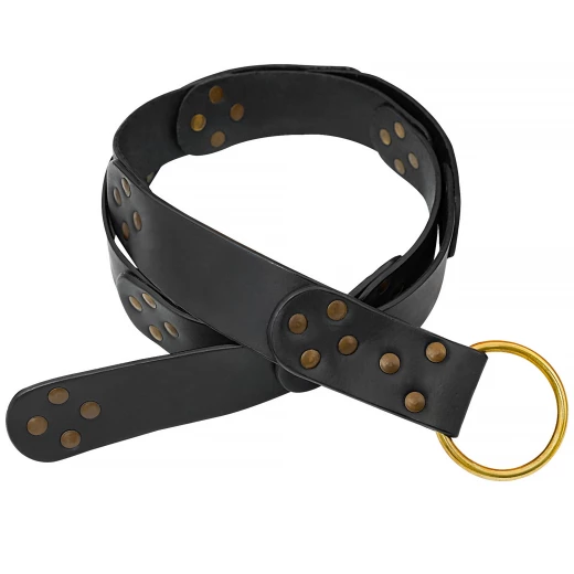 Gürtel mit Ringschnallen waren über Jahrhunderte beliebt, vom Frühmittelalter (z.B. bei den Wikingern) bis zur Renaissance. Sie sind einfach, funktional und haben keine komplizierten mechanischen Teile, die im Kampf beschädigt werden könnten. Dieses spezielle genietete Design passt hervorragend zu Kostümen von Piraten, Plünderern, Söldnern oder jedem Charakter, der Wert auf Haltbarkeit und einen rauen Stil legt.