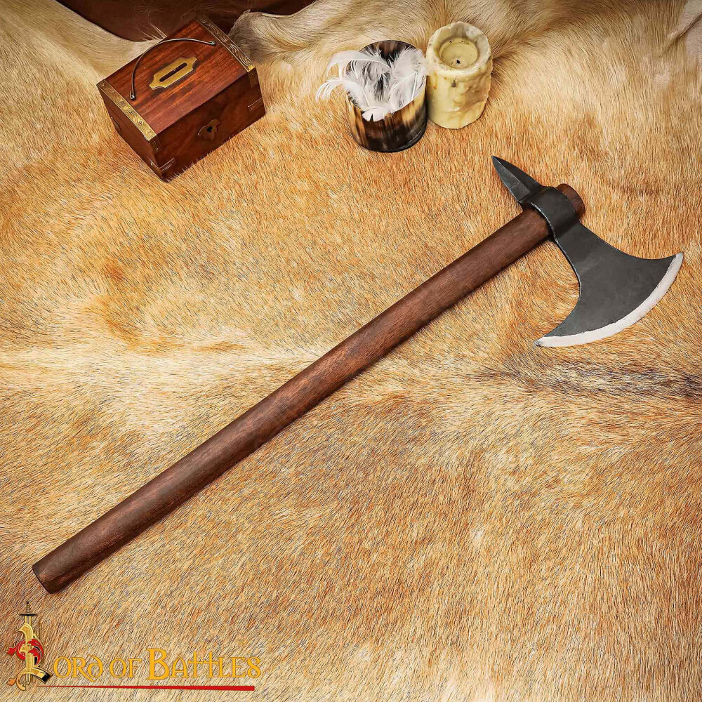 Die Gorm Viking Streitaxt verfügt über eine robuste Konstruktion aus Kohlenstoffstahl, die eine lange Lebensdauer garantiert. Der handgeschmiedete Axtkopf mit seiner breiten Klinge und dem Dorn auf dem Rücken ist das Ergebnis geschickter Handwerker.