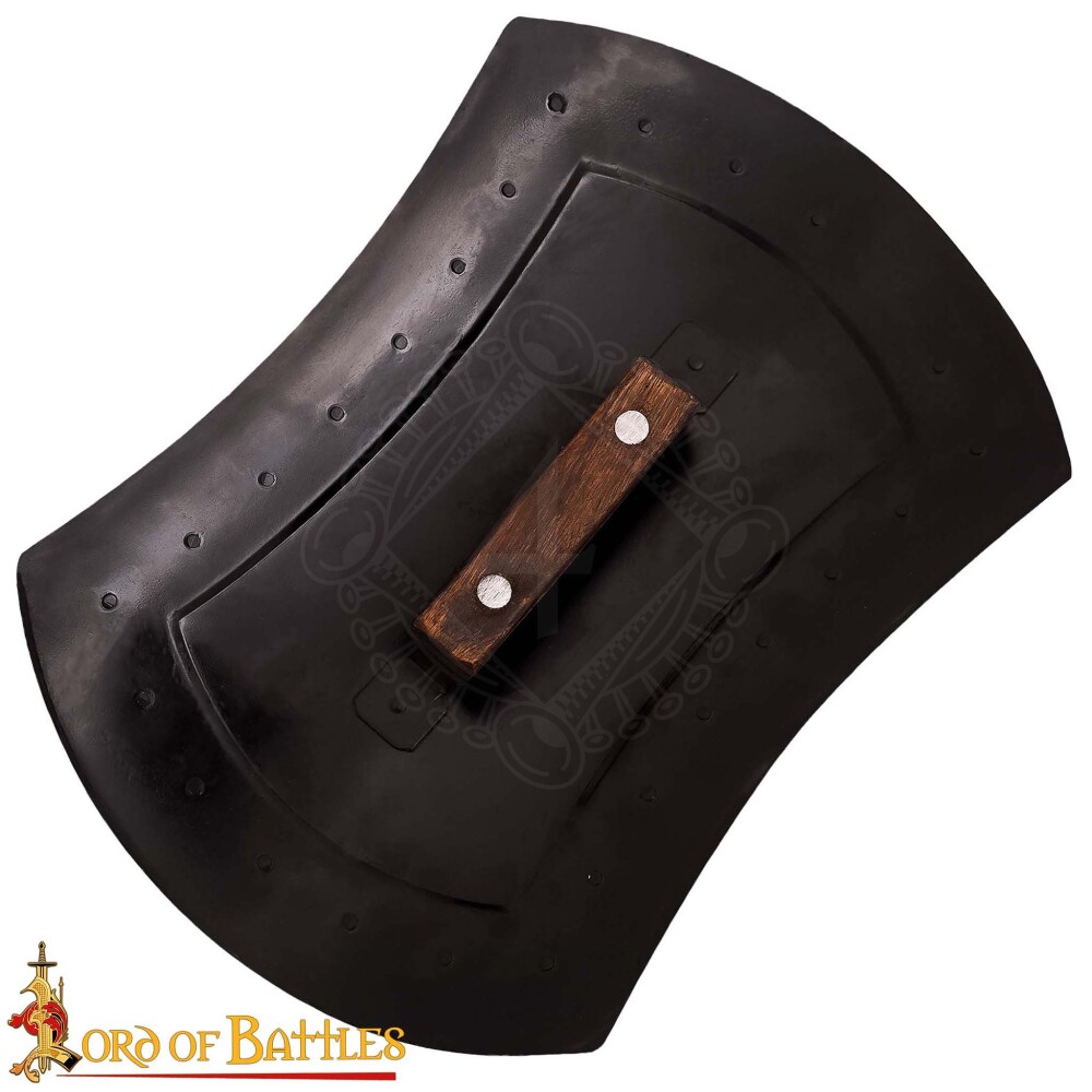 Das Produkt ist in reiner Handarbeit gefertigt, um den harten Schlägen von Stahlklingen standzuhalten. Das Grundmaterial ist kaltgewalzter Baustahl mit einer Stärke von 1,6 mm, was den gängigen Standards für historisches Fechten und Schaukampf entspricht. Der Rand des Schildes ist mit Nieten verstärkt, was die strukturelle Integrität erhöht und das Spalten der Kanten verhindert. Die Rückseite ist mit einer schwarzen Lackierung versehen, die als Basis-Rostschutz dient. Für einen sicheren und komfortablen Griff sorgt eine massive Metallstange, die fachgerecht mit echtem Hartholz verkleidet ist. Das Holz spielt eine essenzielle Rolle, da es Vibrationen und Stöße absorbiert, die sonst direkt in deine Handflächen abgeleitet würden.
