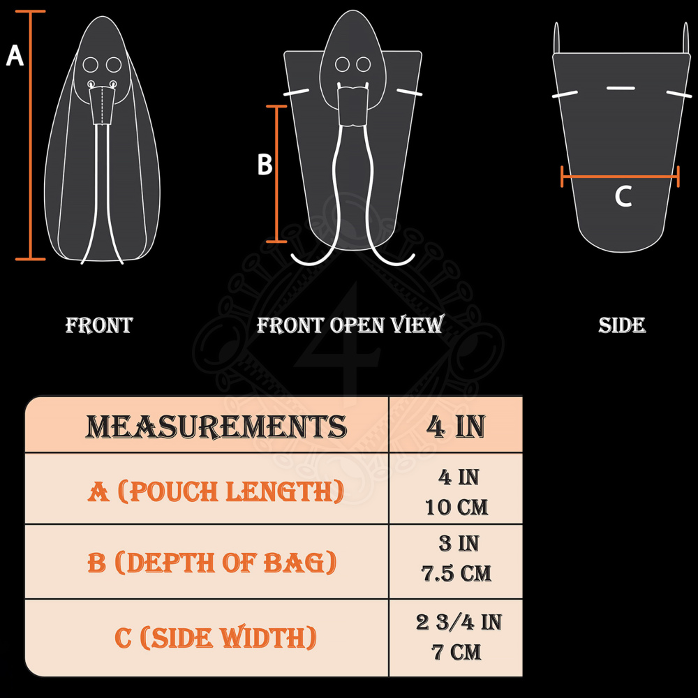Dieser Beutel besticht durch sein klassisches „Gold- und Würfelbeutel“-Design, das von mittelalterlichen Accessoires inspiriert ist. Er ist aus hochwertigem schwarzem Wildleder mit einer Stärke von ca. 1,3–1,5 mm gefertigt, was ihm die perfekte Balance zwischen Flexibilität und Festigkeit verleiht. Der obere Teil des Beutels ist mit einem Glattlederteil verstärkt und mit zwei Metallnieten versehen, die sicherstellen, dass die Öffnung für die Zugschnur auch bei häufigem Gebrauch nicht ausreißt.