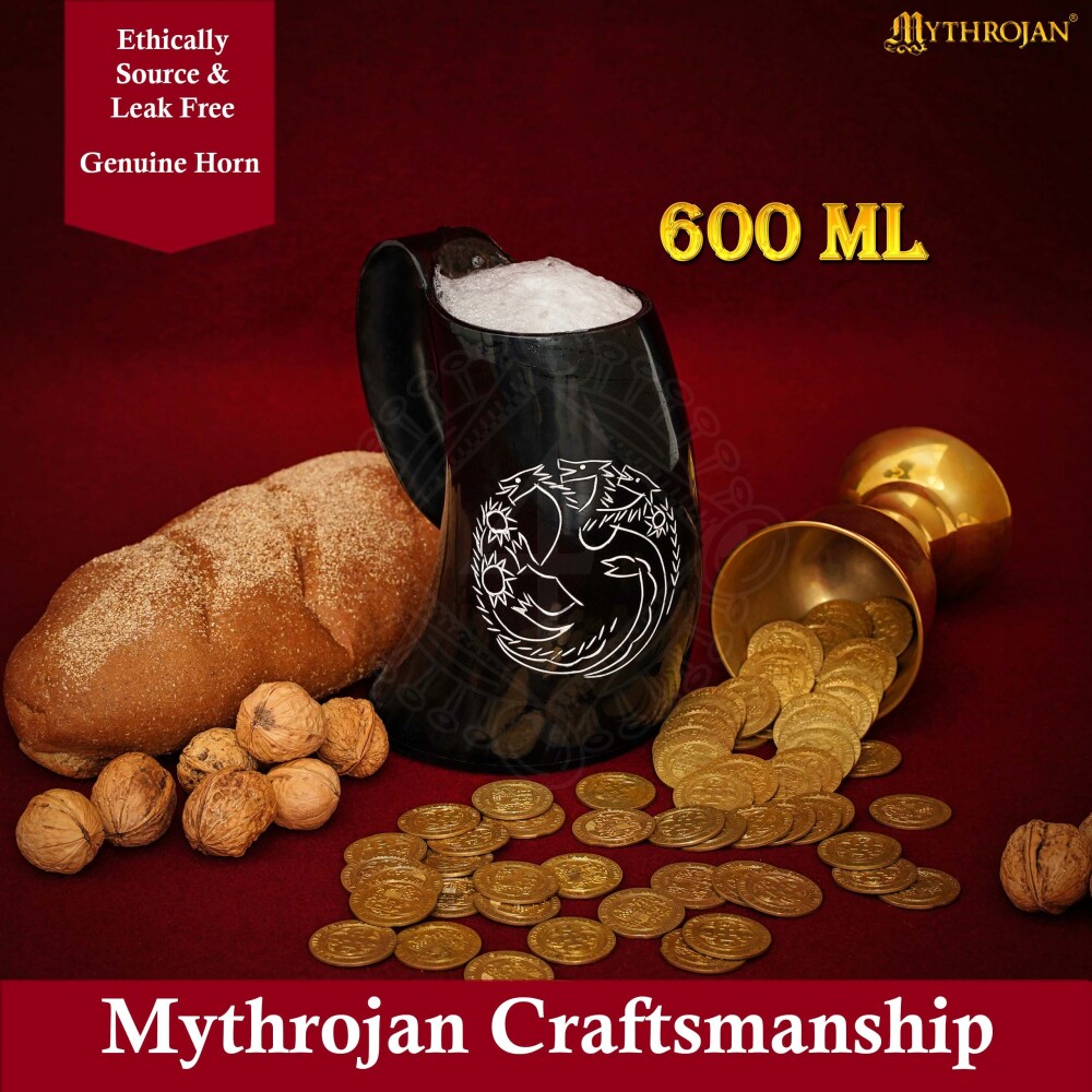 Der dreiköpfige Drache ist in der Fantasy-Welt (bekannt aus dem Lied von Eis und Feuer) das Symbol der Eroberer. Die Köpfe repräsentieren Aegon und seine Schwestern, die auf dem Rücken von Drachen Westeros vereinten. Historisch gesehen waren Trinkgefäße aus Horn bei germanischen Stämmen und Wikingern weit verbreitet. Während das einfache Volk aus schlichten Hörnern trank, nutzten Häuptlinge und Könige reich verzierte Krüge, um ihren Status zu demonstrieren. Mit diesem Stück in der Hand zeigst du deutlich, dass du mehr als nur ein einfacher Fußsoldat bist.