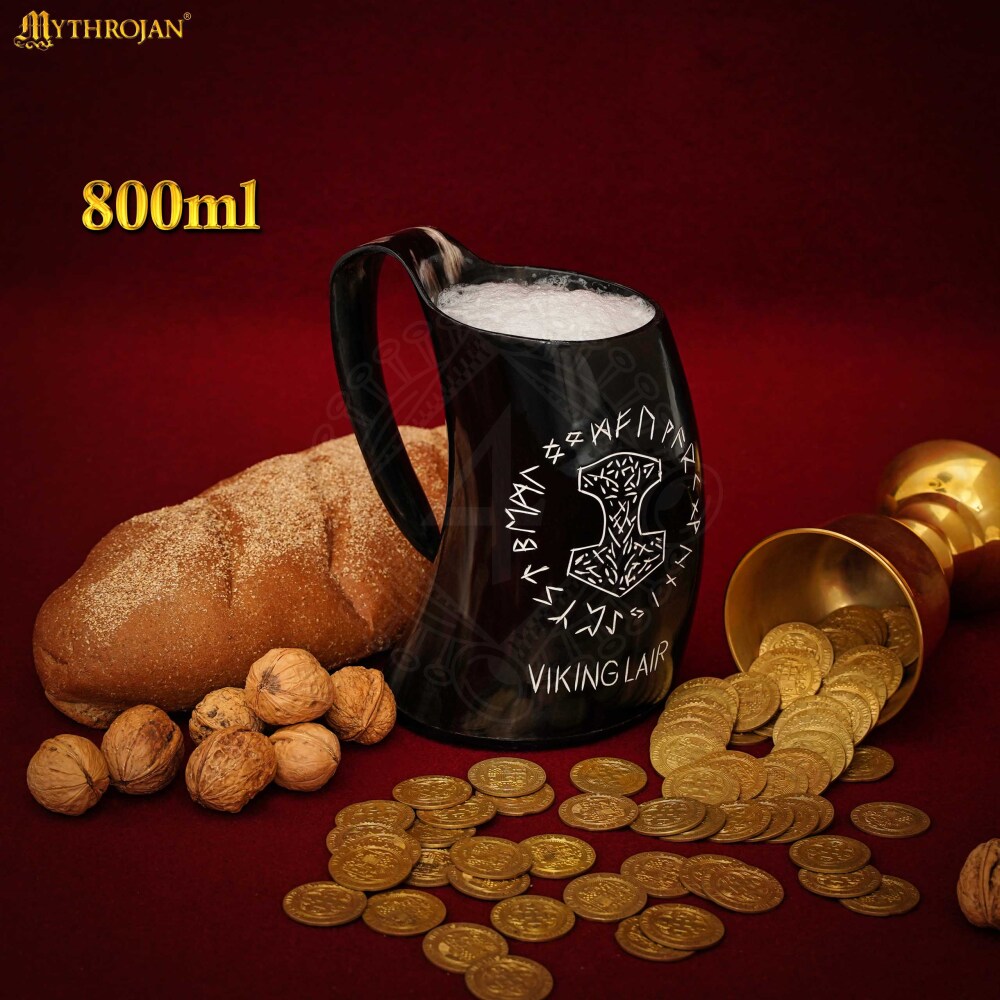 Erhebe diesen mächtigen Krug aus echtem Horn und stoße mit der Kraft des Donnergottes an! Sein dominantes Merkmal ist die detaillierte Gravur von Thors Hammer Mjölnir, umgeben von einem schützenden Runenkreis, der Stärke, Schutz und Mut symbolisiert. Dieser Premium-Krug der Marke Mythrojan wird von Hand aus ethisch gewonnenem Naturhorn gefertigt, wodurch jedes Stück zu einem absoluten Original mit einzigartiger Form und Farbe wird. Die Innenfläche ist mit gesundheitlich unbedenklichem, lebensmittelechtem Harz behandelt, das sicherstellt, dass Dein Getränk nicht ausläuft. Dies ist nicht nur ein Trinkgefäß – es ist ein Stück Wikinger-Erbe und ein Symbol Deiner inneren Stärke. Weitere Produktinformationen ...