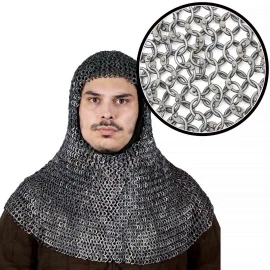 Die Haube ist sorgfältig im europäischen 4-in-1-Muster geflochten, bei dem jeder Ring durch vier andere geht. Es werden unvernietete (stumpfe) Ringe mit einem Innendurchmesser von 10 mm aus Baustahl (16 Gauge / 1,6 mm) verwendet. Diese Art der Konstruktion ist flexibel, angenehm zu tragen und stellt eine erschwingliche Variante der Kettenrüstung dar. Die Haube hat einen anatomischen Schnitt, der Kopf und Hals bedeckt und sich zu einem Kragen erweitert, der die Schultern schützt.