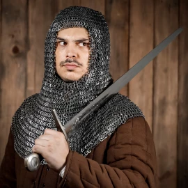 Die brünierte Oberfläche (Oxidation) verleiht der Haube eine authentische Patina und schützt den Stahl gleichzeitig vor Oberflächenrost. Sie ist die perfekte Wahl für den Charakter eines Plünderers, Söldners, Ritters oder eines anderen Kriegers bei LARP- und SCA-Veranstaltungen. Sie bietet grundlegenden Kostümschutz und sieht in Kombination mit einem Gambeson oder unter einem Helm hervorragend aus.