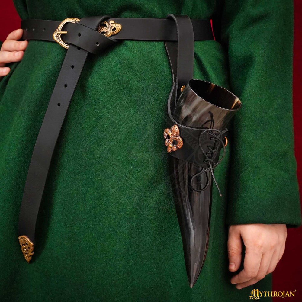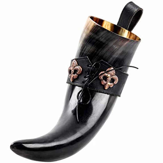 Dieses Ritter-Trinkhorn wird von Hand aus einem einzigen Stück ethisch unbedenklichem Rinderhorn gefertigt. Seine Oberfläche ist sorgfältig auf Hochglanz poliert, was die natürliche Maserung und die Farbtöne des Materials hervorhebt. Jedes Horn ist somit ein absolutes Unikat mit individueller Form und Färbung, von hellen bis zu dunklen Schattierungen. Das Horn ist mit einem schwarzen Gürtelhalter aus echtem Leder ausgestattet, der mit zwei metallenen Emblemen der Fleur-de-Lis in Kupfer- oder Bronzefarbe verziert ist. Dank der einfachen Schnürung passt sich der Halter perfekt an die Form des Horns an. Das Produkt ist garantiert auslaufsicher, sodass du dein Lieblingsgetränk ohne Verluste genießen kannst.
