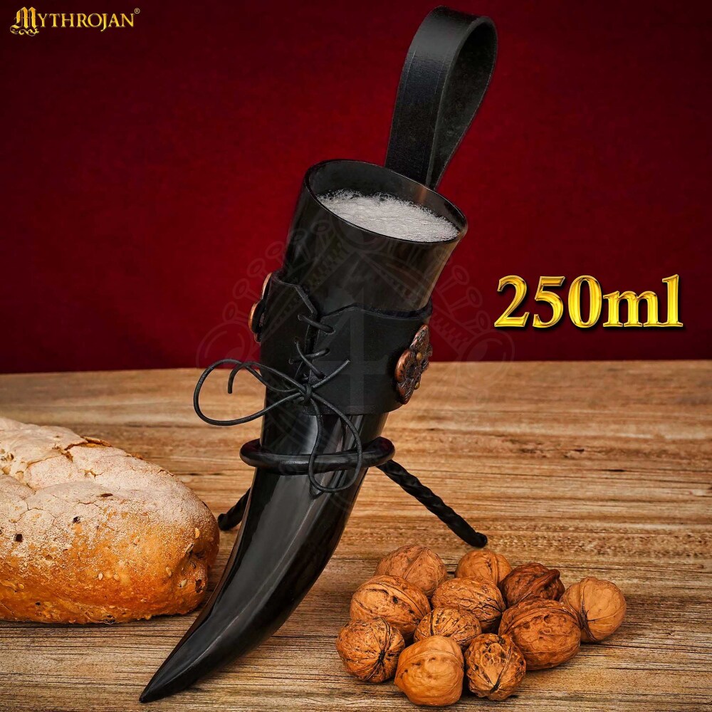 Egal, ob du dich auf ein Ritterturnier, ein Mittelalterfest oder einfach nur auf ein Beisammensein am Lagerfeuer vorbereitest, dieses Trinkhorn ist die ideale Wahl. Du kannst zwischen einer kleineren Variante mit 250 ml oder einer größeren mit 600 ml für wirklich durstige Helden wählen. Dank des Lederhalters für den Gürtel hast du das Horn immer sicher zur Hand und musst es nicht ständig ablegen. Zum Schutz vor Kratzern beim Transport erhältst du zusätzlich einen hochwertigen Stoffbeutel mit dem Mythrojan-Logo, der sich ideal zur Aufbewahrung und für den Transport eignet.