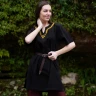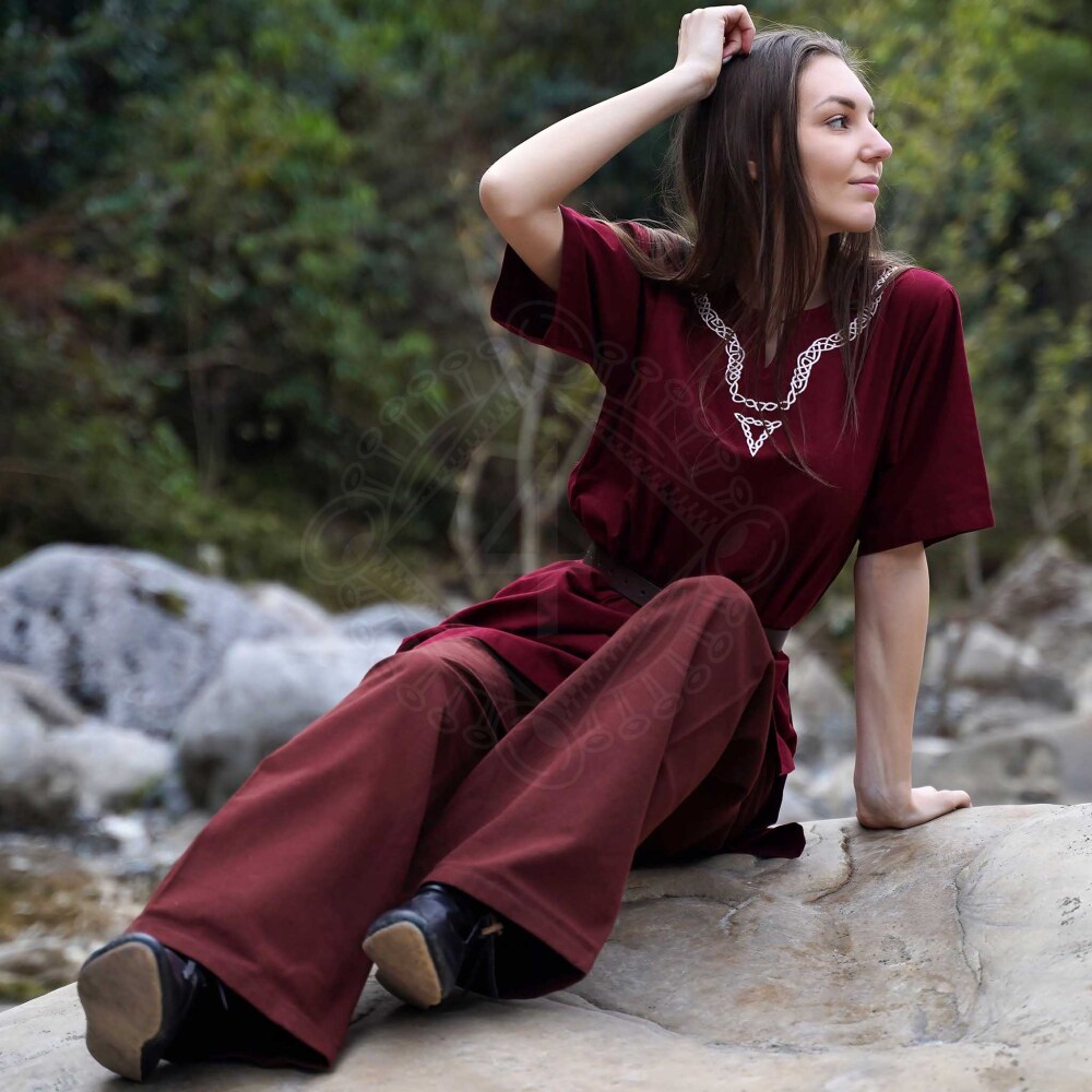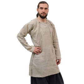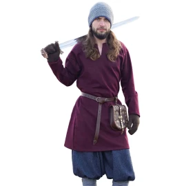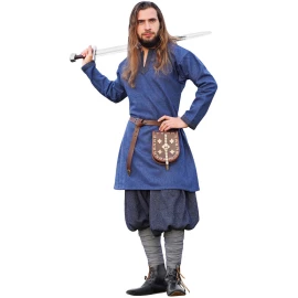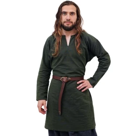 Die Tunika war jahrhundertelang das Basis-Kleidungsstück in vielen europäischen Kulturen. Sie wurde von Männern und Frauen aller Gesellschaftsschichten getragen, von Wikingern und Kelten bis hin zu Römern und den Bewohnern des frühmittelalterlichen Europas. Während lange Ärmel üblich waren, besonders in kühlerem Klima oder für formellere Anlässe, wurden auch Tuniken mit kurzen Ärmeln oder ärmellose Varianten häufig verwendet. Sie boten mehr Komfort bei warmem Wetter, erleichterten körperliche Arbeit und dienten oft als Untergewand. Verzierungen, wie die Stickerei auf dieser Tunika, unterschieden dann Kleidungsstücke für besondere Anlässe oder zeigten den Status des Trägers an.