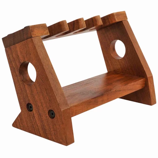Der Ständer ist aus hochwertigem, perfekt getrocknetem Akazien-Massivholz gefertigt. Dieses Holz ist bekannt für seine hohe Härte, Widerstandsfähigkeit und seine wunderschöne, markante Maserung, die jedem Stück einen einzigartigen Charakter verleiht. Die Oberfläche des Ständers hat einen warmen, rotbraunen Farbton und ist präzise mit Liebe zum Detail verarbeitet, was sein luxuriöses Aussehen unterstreicht. Die Konstruktion besteht aus zwei stabilen Seitenstützen und einer soliden Grundplatte, die mit dem Oberteil verbunden sind, welches über vier sorgfältig geformte Nuten zur sicheren Aufbewahrung der Waffen verfügt. Robuste, sichtbare Schrauben an den Seiten vervollständigen nicht nur das industriell-elegante Design, sondern garantieren auch die außergewöhnliche Festigkeit der gesamten Konstruktion.