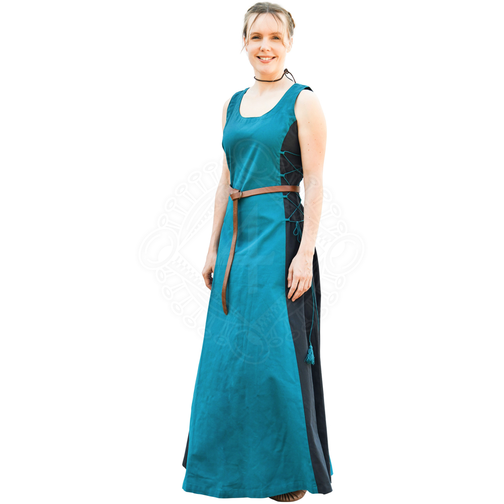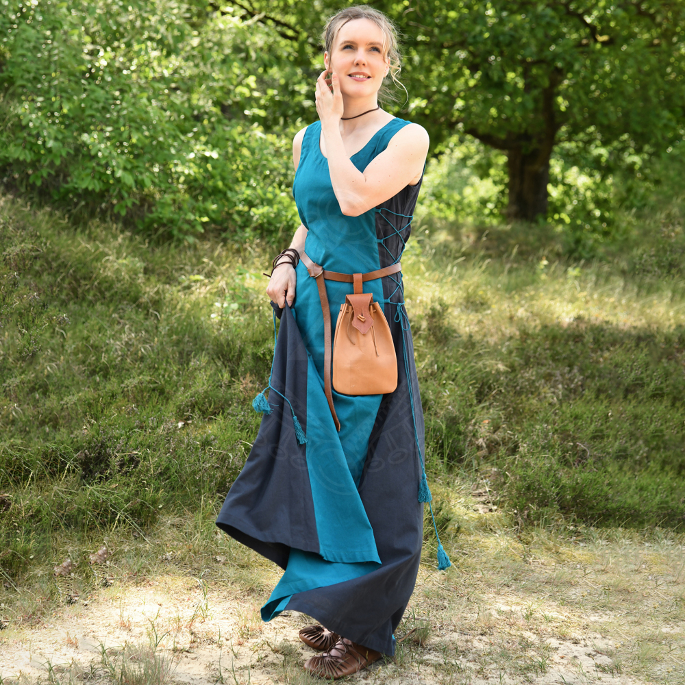 Dieses mittelalterliche Sommerkleid aus Baumwollstoff ist locker geschnitten und kann mittels Schnürungen an der Taille individuell angepasst werden. Die seitlich eingesetzten, naturfarbenen Stoffstreifen kreieren eine schlanke Silhouette und bringen die Schnürung besonders zur Geltung. Das Kleid ist bodenlang und der Saum weit ausgestellt. Weitere Produktinformationen ...