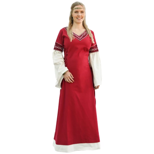 Dieses lange mittelalterliche Kleid aus festem Baumwollstoff ist locker geschnitten und lässt sich dank seitlicher Schnürungen individuell anpassen. Ärmel und Saum sind farblich abgesetzt und erzeugen so den Eindruck eines Unterkleides. Der Ausschnitt und der Ärmelsaum sind mit einer Stickerei verziert. Weitere Produktinformationen ...