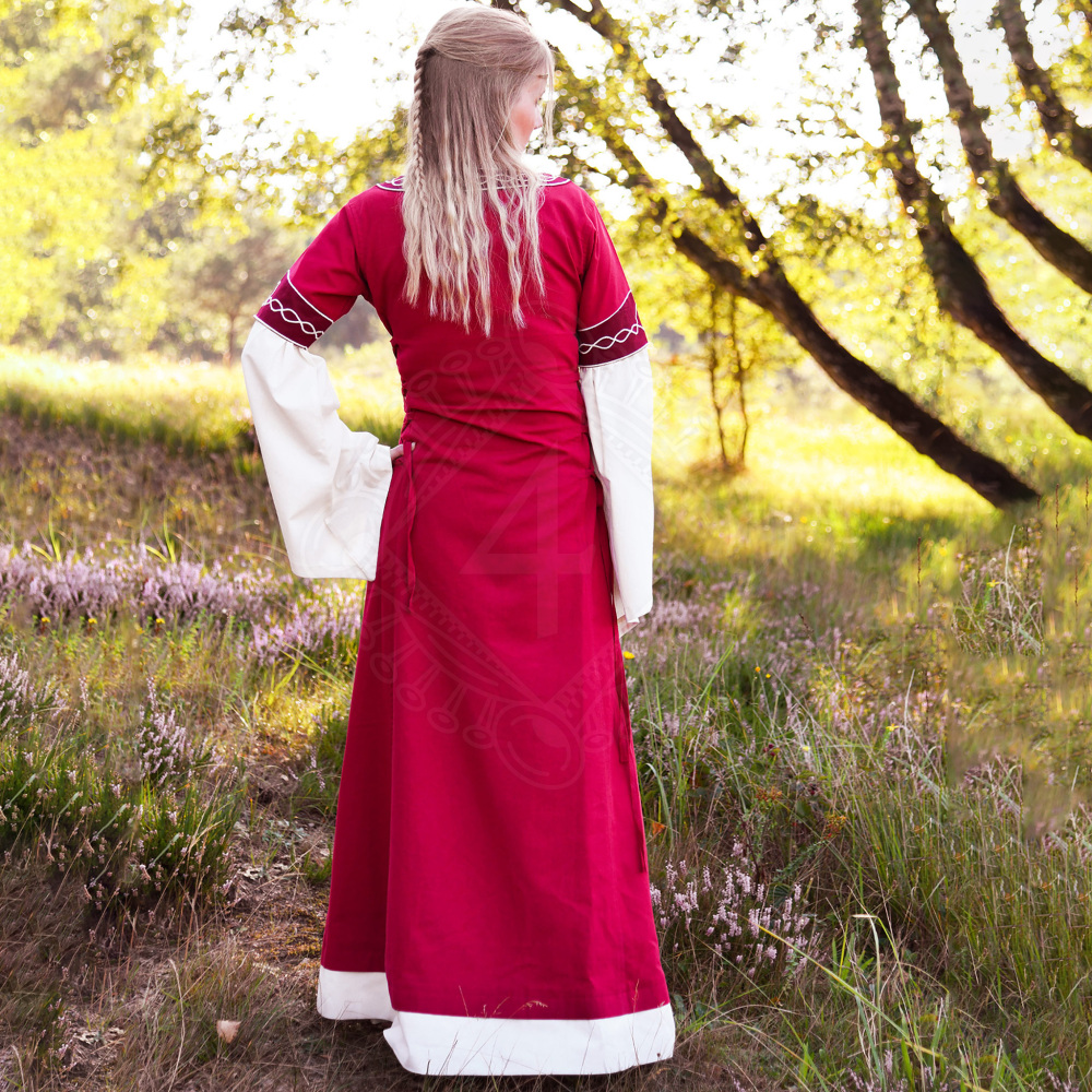 Dieses mittelalterliche Kleid ist Teil der Kollektion für historische Gewandung und Mittelalter-Kleidung für Herren, Damen und Kinder. Von der ersten Zeichnung bis zum letzten Nadelstich wurde dieses Kleidungstück mit besonderer Liebe zu Detail geplant, designt und in echter handwerklicher Arbeit hergestellt. Der Hersteller orientiert sich bei seiner Kleidung mehr oder weniger exakt an ihren historischen Vorbildern, Grabfunden oder Museumsstücken, sofern es solche gibt. Änderungen z.B. für die Anpassungen an heutige Größen und Arbeitsweisen hält er so gering wie möglich. Überzeuge Dich selbst!
