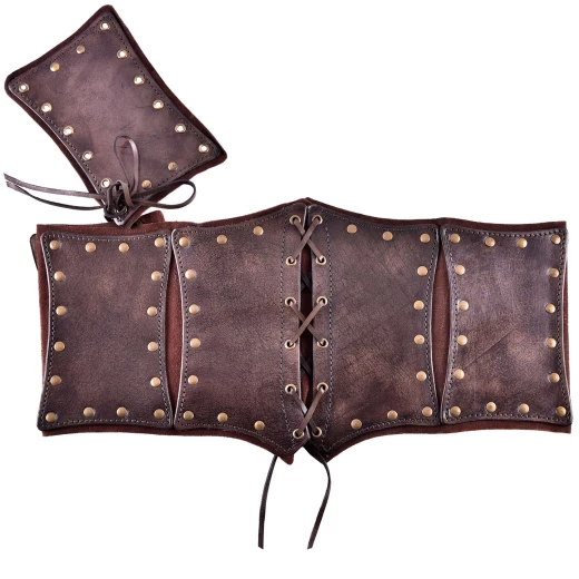 Diese sehr schön gearbeitete Corsage mit Nieten besteht aus zwei Lagen pflanzlich gegerbtem Leder. Die obere Lage ist aus dickem Büffelleder (Narbenleder) und die untere Lage aus dünnerem Wildleder gefertigt. Beide Lagen sind miteinander vernäht und vernietet. Weitere Produktinformationen ...