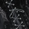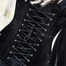 Diese Unterbrust-Corsage ist aus schwarzem Samt gefertigt und mit einem Baumwollfutter versehen. Die Längsnähte sind mit Stäben verstärkt. Diese kreieren beim Schnüren eine wunderbar weibliche Silhouette. Die Corsage wird an der vorderen- und hinteren Mitte auf Taillenhöhe geschnürt. Ein Untertritt an der hinteren Mitte verdeckt den Spalt der bei der Schnürung sonst freibleiben würde. Das Schnürband ist leicht elastisch, was dem Schnüren und dem Tragekomfort sehr zugutekommt.