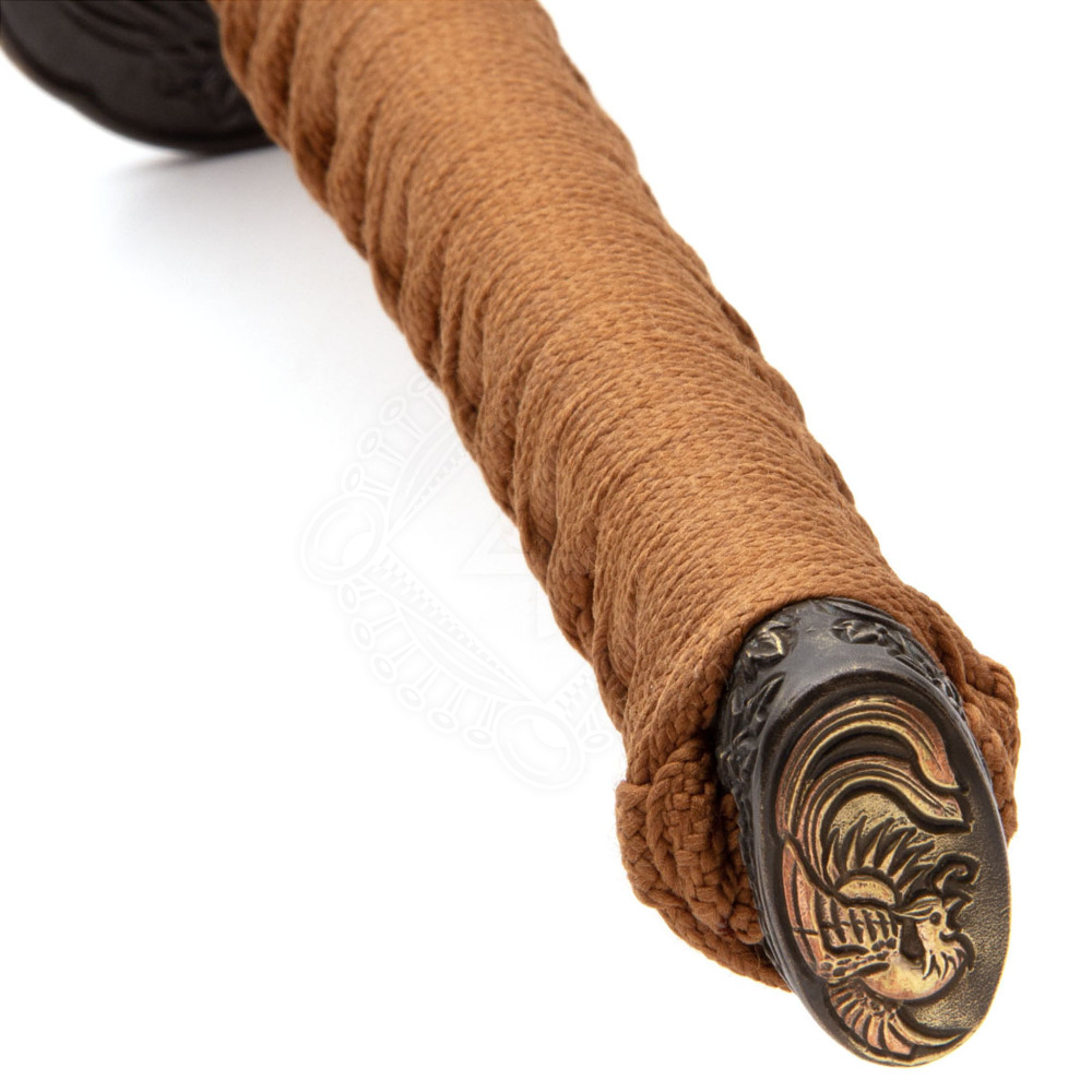 - Griff (Tsuka): Der Holzkern ist mit echter Rochenhaut (Samegawa) überzogen und traditionell fest mit einer braunen Baumwollkordel (Tsuka-ito) umwickelt.
