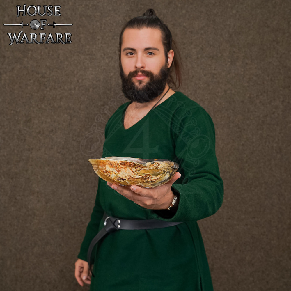 Gönn dir eine Mahlzeit aus einer stilvollen Schale, die dich in die Zeit der alten Helden und Legenden versetzt. Diese ovale Hornschale wird von Hand aus echtem, ethisch gewonnenem Horn gefertigt. Dadurch ist jedes Stück ein absolutes Original – es unterscheidet sich nicht nur in seiner Form, sondern auch durch die einzigartige Farbe und Maserung, die die Natur selbst geschaffen hat. Ihre glatte, polierte Oberfläche und ein Fassungsvermögen von ca. 500–550 ml machen sie zum idealen Begleiter für deine kulinarischen Erlebnisse, egal ob du auf einem Mittelalterfest, beim LARP oder einfach nur dein Abendessen mit einem außergewöhnlichen Akzent genießen möchtest. Weitere Produktinformationen ...