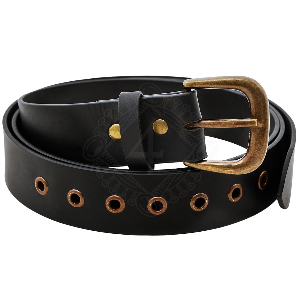 Der Gürtel ist aus einem einzigen Stück dicken Büffelleders mit einer Stärke von über 3 mm gefertigt. Seine Breite von 3,8 cm garantiert einen angenehmen Tragekomfort und passt perfekt durch die Schlaufen der meisten Hosen. Die Kanten des Gürtels sind speziell behandelt, um ein Ausfransen zu verhindern und so seine Lebensdauer zu verlängern. Die Löcher für den Dorn sind mit Metallösen in Messingoptik verstärkt, was ihre Widerstandsfähigkeit gegen Ausreißen deutlich erhöht. Das dominierende Merkmal des Gürtels ist die massive und elegante Schnalle aus massivem Messing, deren Oberfläche mit einer antiken Patina versehen ist, die ihm einen einzigartigen historischen Look verleiht.