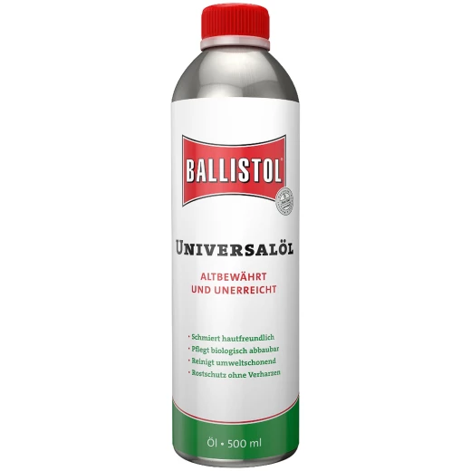 - Ob für Mensch, Tier oder Technik – Ballistol Universalöl ist das wohl vielseitigste Universalöl überhaupt. Es pflegt, konserviert, reinigt, schützt und schmiert daheim, am Arbeitsplatz und unterwegs. Unersetzlich für Handwerk, Haus, Hobby und Industrie – Ballistol Universalöl ist das richtige Öl für 1000 Fälle und mehr.