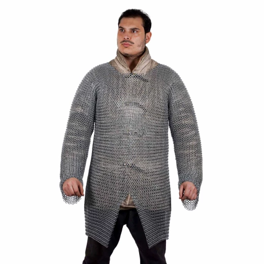 Tritt ein in die Welt der Ritter, Normannen und tapferen Krieger mit diesem klassischen Kettenhemd! Diese Art von Rüstung, bekannt als Hauberk, bildete jahrhundertelang den grundlegenden Körperschutz für Kämpfer in ganz Europa. Unsere Version ist aus robusten Stahlringen gefertigt, die „gestoßen“ verbunden und zusätzlich für maximale Haltbarkeit und minimale Wartung verzinkt sind. Dank der oberschenkellangen Ausführung und den langen Ärmeln bietet es hervorragenden Schutz und schränkt durch die Schlitze vorne und hinten die Bewegungsfreiheit nicht ein, egal ob du zu Fuß oder zu Pferd unterwegs bist. Weitere Produktinformationen ...