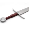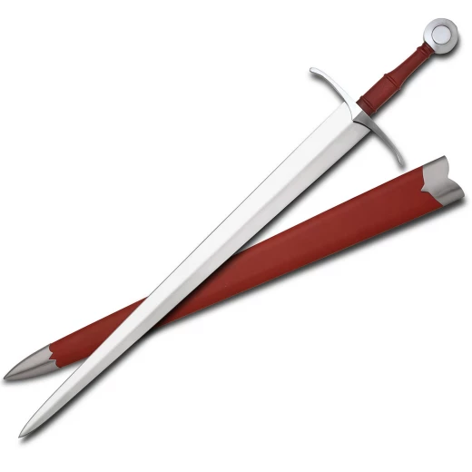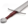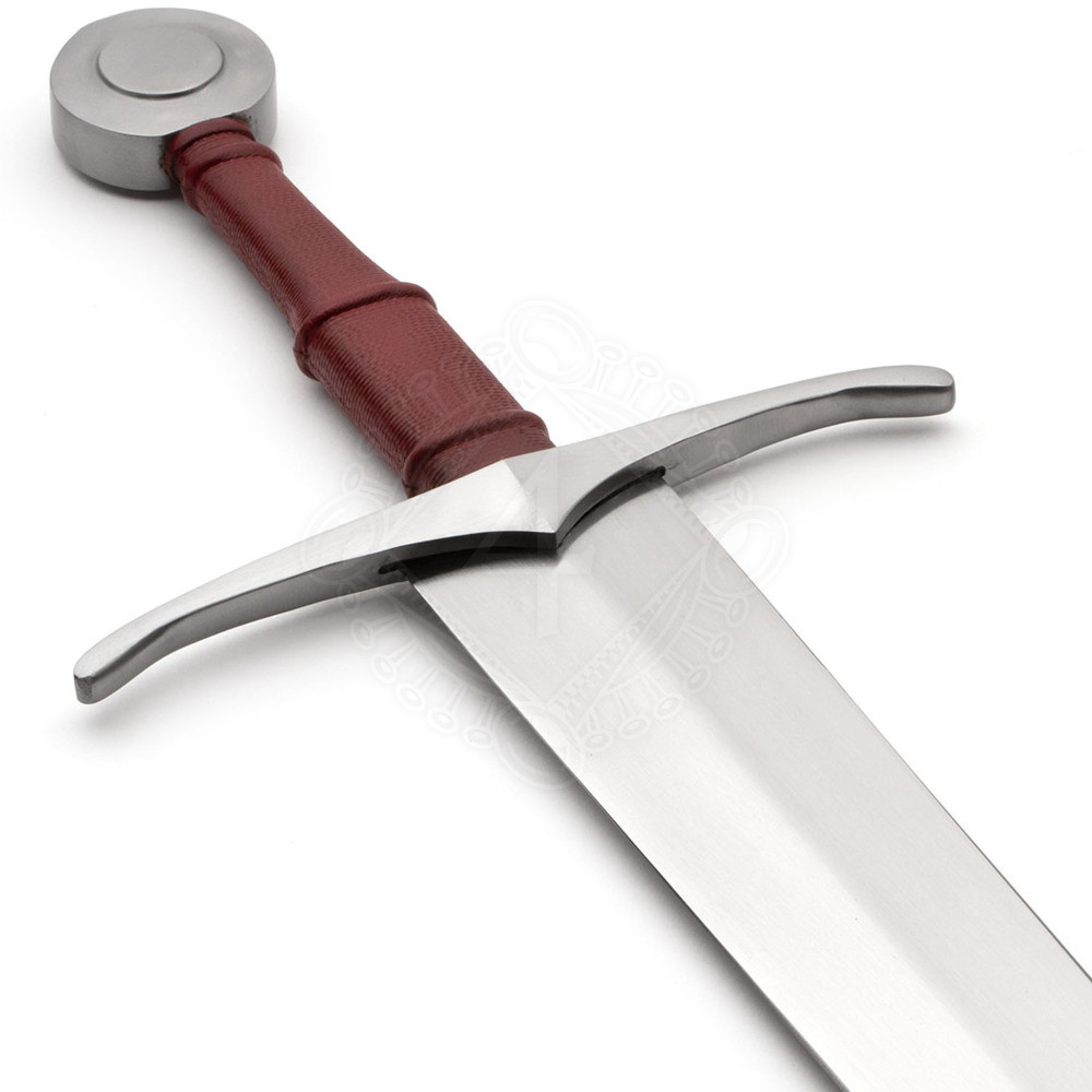 Dieses schöne Kriegsschwert des Typs XVIIIa ist nach der Schlacht von Arbedo benannt, wo es sich möglicherweise in der Ausrüstung beider Kriegsparteien befand. Die effektive Klinge verjüngt sich zu einer scharfen, tödlichen Spitze. Der sechs Zoll lange Griff ermöglicht eine ein- oder zweihändige Handhabung. Die Klinge ist aus kohlenstoffreichem Stahl gefertigt. Die Parierstange und der Knauf sind aus Stahl. Der Griff ist aus Holz, mit Seil umwickelt und dann mit rotem Leder überzogen. Die Klinge hat eine breite Angel, die den Kern des Griffs bildet.