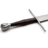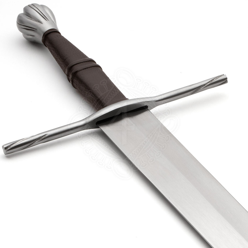 Dieses Schwert befindet sich in der Rüstkammer des deutschen Schlosses Erbach und ist ein schönes Beispiel für ein Schwert aus dem Hochmittelalter/der Renaissance (klassifiziert als Oakeshott-Typ XVIII A). Es ist ein wirklich schönes Beispiel für ein Bastardschwert, das sich sowohl zum Schneiden als auch zum Stoßen eignet. Die Stahlteile sind sehr dekorativ und die Klinge aus Kohlenstoffstahl ist leicht hohlgeschliffen, wodurch sich das Schwert gut mit einer oder beiden Händen führen lässt.