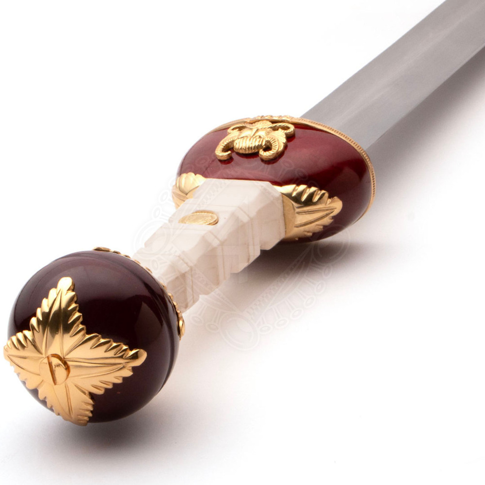Der Griff und die Scheide sind mit aufwändigen Messingornamenten verziert, die den ästhetischen Eindruck der Waffe verstärken. Die hölzerne Parierstange und der Knauf sind mit Messing akzentuiert und das Caesar-Medaillon ist in den gewellten Kunststoffgriff (Elfenbeinimitation) eingelassen. Die zweischneidige Klinge ist werkseitig geschärft.