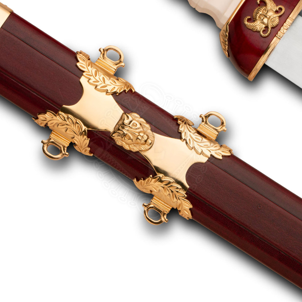 Das Ganze wird durch eine Lederscheide mit Holzkern und Gürtel vervollständigt, die durch hochrangige Messingbeschläge, darunter der Löwenkopf, ergänzt wird.