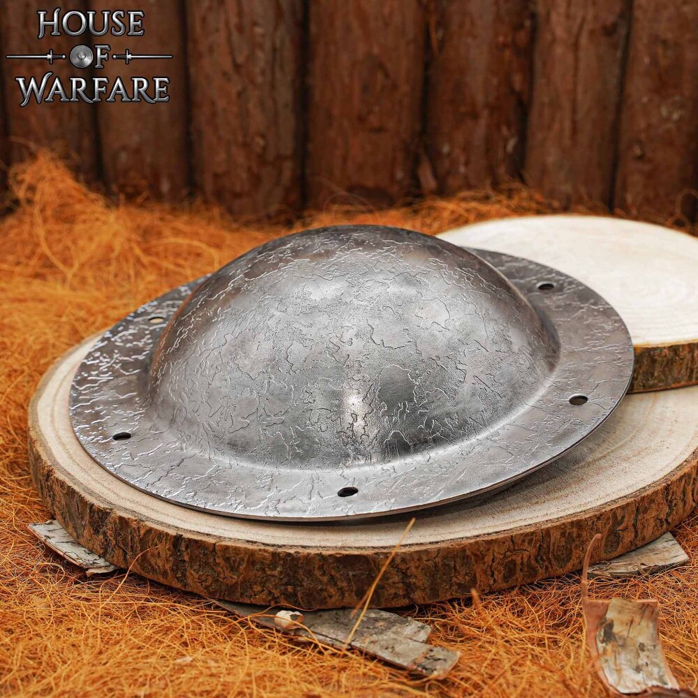 Vervollständige deinen Schild mit dem wichtigsten defensiven Element – mit diesem ehrlichen Stahlschildbuckel der Marke House of Warfare. Er ist aus 1,8 mm starkem Stahl geschmiedet, wodurch er in die Kategorie „Schaukampftauglich“ fällt und für die anspruchsvollen Bedingungen des historischen Fechtens oder von LARP-Schlachten bereit ist. Die einzigartige patinierte Oberflächenbehandlung verleiht ihm ein authentisches, vom Kampf gezeichnetes Aussehen, als käme er direkt aus dem Getümmel einer Schildwall. Im Lieferumfang findest du alles Notwendige – den Schildbuckel, sechs Nieten und sechs Unterlegscheiben – für die sofortige Montage an deinem Schild. Weitere Produktinformationen ...