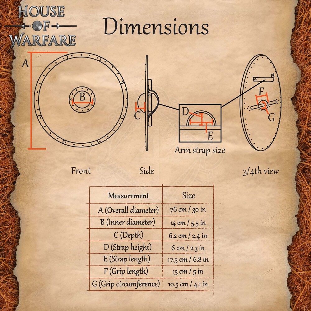 - Stahl: Der stählerne Schildbuckel ist aus Kohlenstoffstahl gefertigt, der rosten kann. Halte ihn trocken und reinige und trockne ihn nach einer Schlacht immer. Reibe ihn leicht mit einem Konservierungsöl (z. B. WD-40 oder Ballistol) ein.