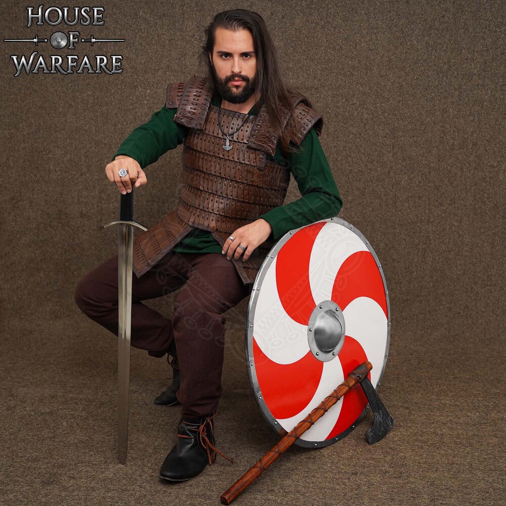 Dieser Schild ist ideal für Krieger, die auf dem Schlachtfeld auffallen wollen. Das markante Spiralmuster garantiert, dass dich niemand übersieht, egal ob du in den Reihen der Kämpfer bei einer historischen Nachstellung stehst oder an einer LARP-Schlacht teilnimmst. Er ist eine ausgezeichnete Wahl für diejenigen, die eine Ausrüstung wollen, die nicht nur funktional, sondern auch visuell beeindruckend ist. Außerhalb des Schlachtfeldes wird er zu einem dominanten und kunstvollen Element an der Wand deines Zimmers, deines Vereinsheims oder deiner Werkstatt.