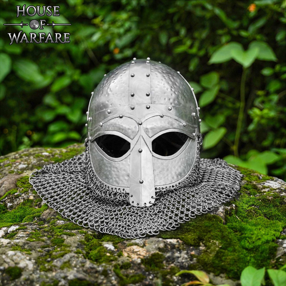 Die angesetzte Kettenbrünne besteht aus unvernieteten Stahlringen (Butted) mit einem Innendurchmesser von 9 mm. Dieser Schutz deckt den Nacken und die obere Schulterpartie zuverlässig ab und vervollständigt das kriegerische Erscheinungsbild.