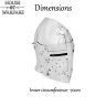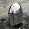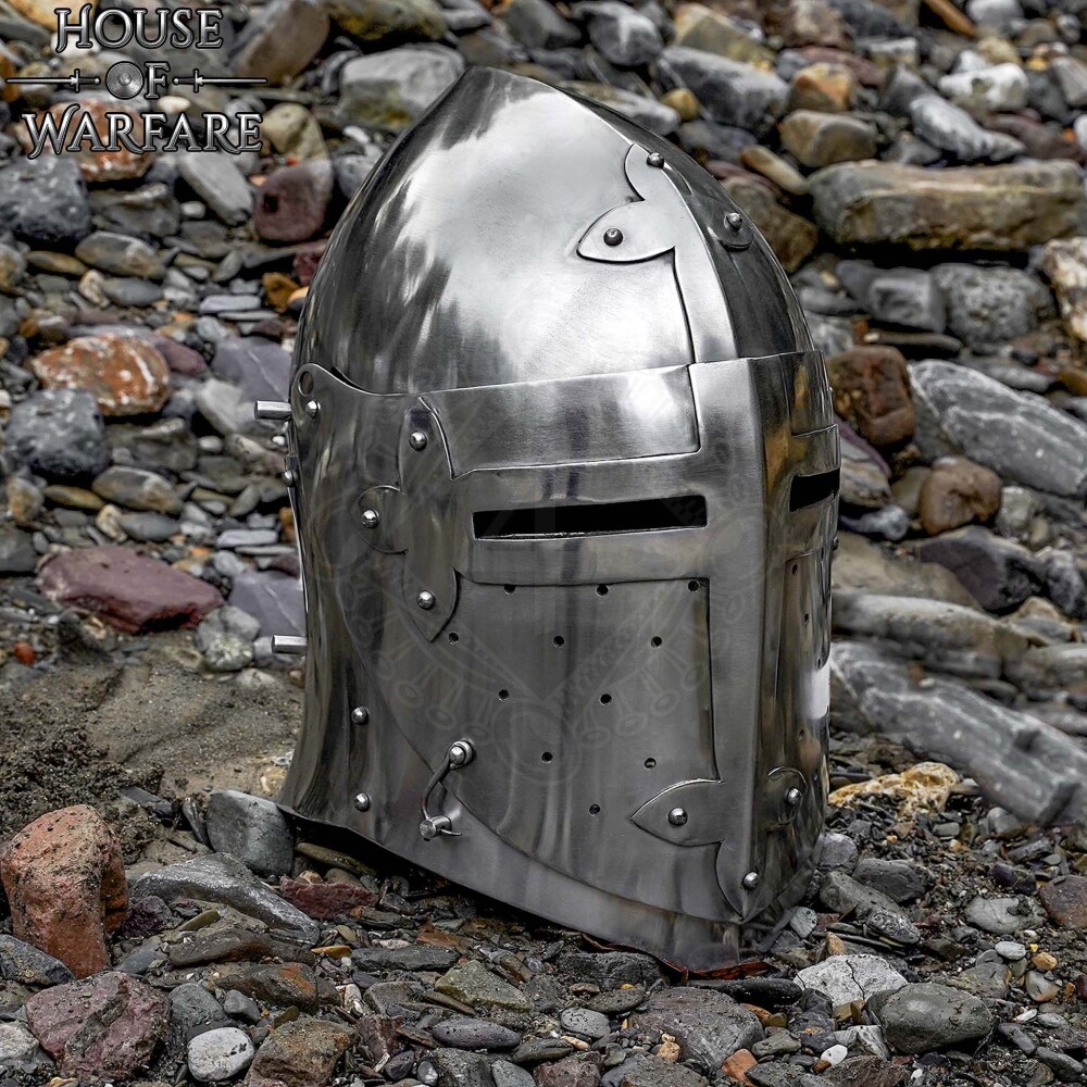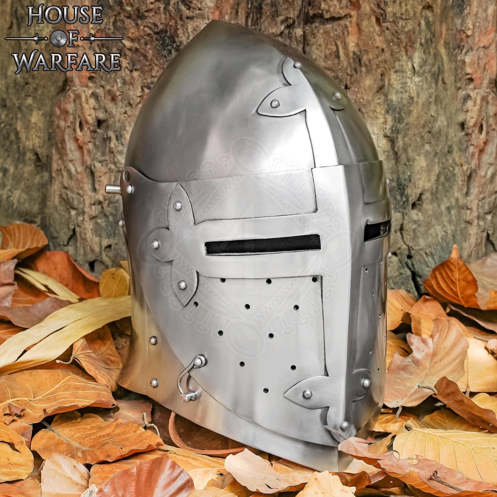 Dieser Helm ist aus 1,6 mm Baustahl handgefertigt und eignet sich für mittelalterliches Reenactment, Mittelaltermärkte und die Nachstellung von echten Kampfsituationen. Die Innenseite ist gepolstert, was für einen hohen Tragekomfort sorgt, und der Helm hat erhebliche stoßdämpfende Eigenschaften. Außerdem hat der Helm einen Innenumfang von 70 cm, wodurch er für die meisten Reenactoren und Mittelalterfans geeignet ist. Das Visier ist beweglich und kann mit zwei seitlichen Stiften hochgeklappt werden. Das Visier kann in der oberen Position mit einem Stift und in der unteren Position mit einem Haken verriegelt werden, um zu verhindern, dass es sich öffnet, zum Beispiel beim Laufen oder Reiten.