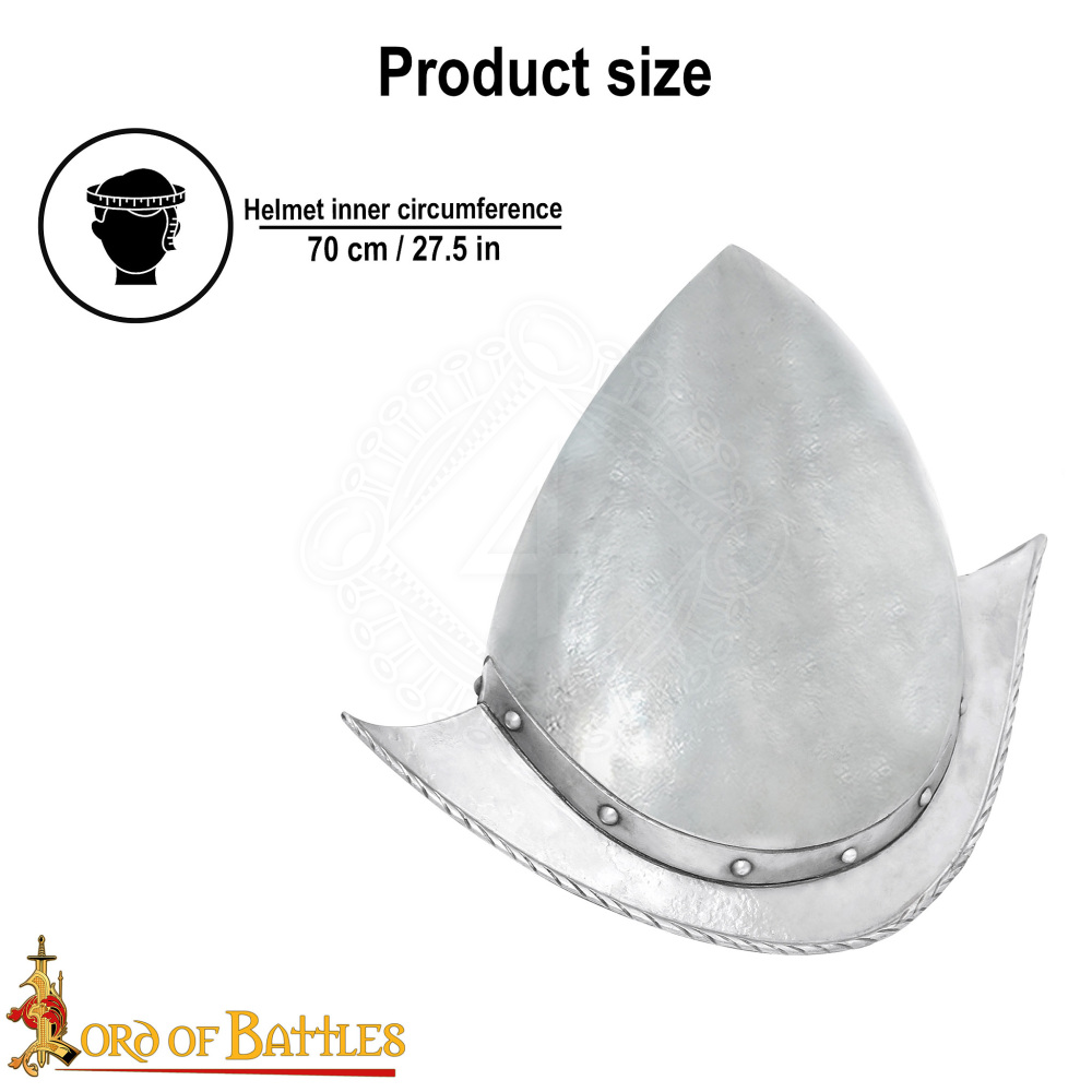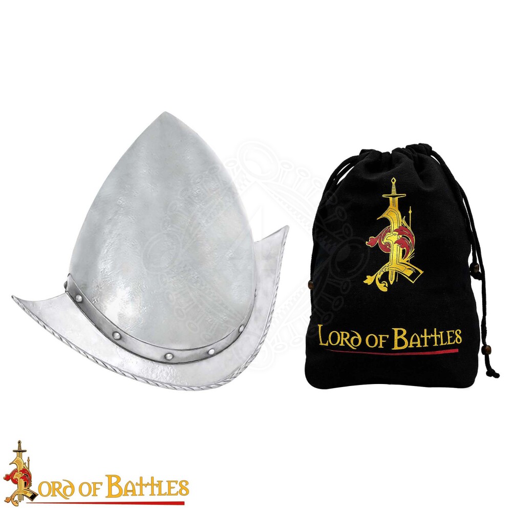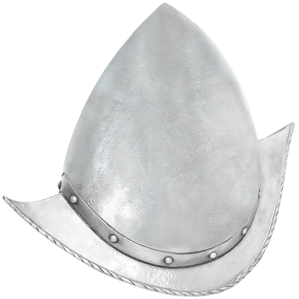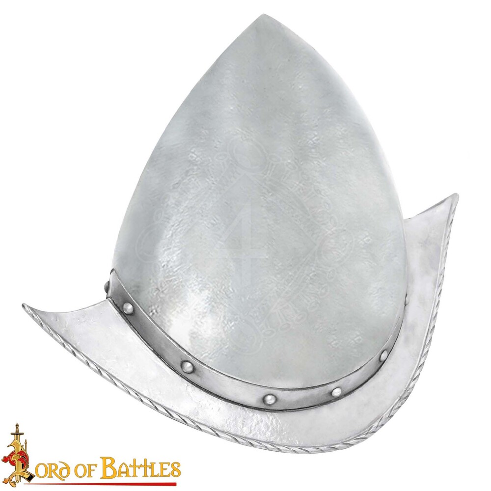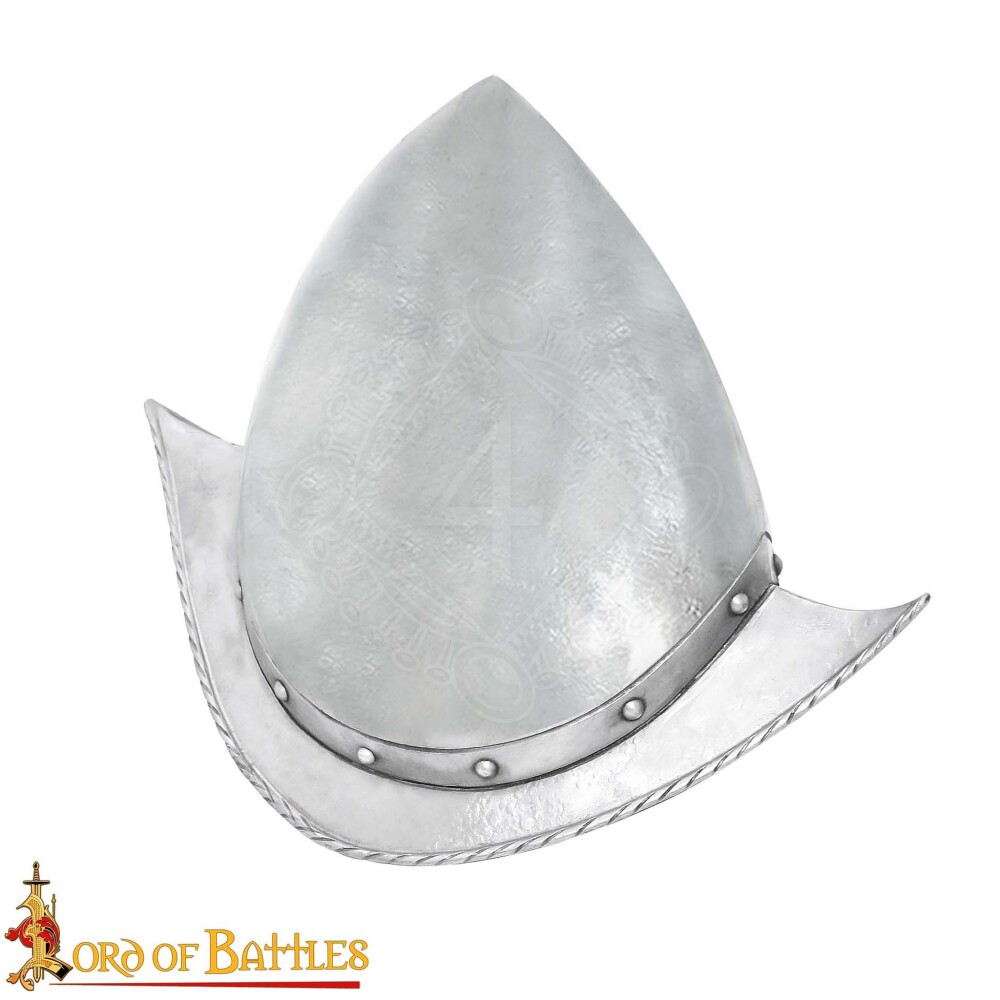 - Ikonische Form: Die hohe, mandelförmige Glocke und die charakteristisch geschwungene Krempe verleihen dem Helm nicht nur sein unverwechselbares Aussehen, sondern wurden auch so konzipiert, dass sie von oben kommende Hiebe und Geschosse effektiv ablenken, was bei Belagerungen entscheidend war.