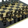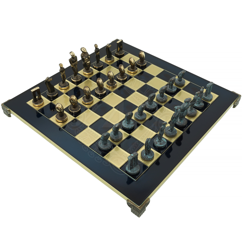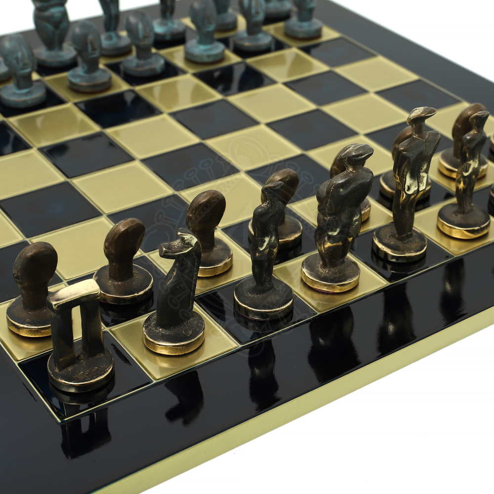 Handgefertigtes Schachspiel Kykladen Kunst aus massivem Messing, Blau und Braun 44x44cm