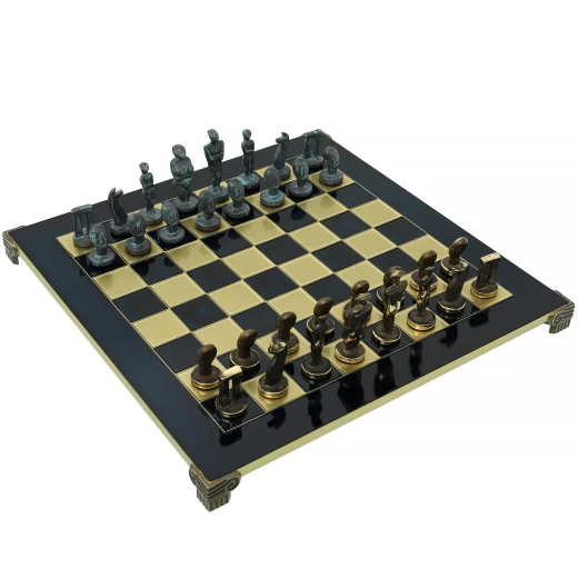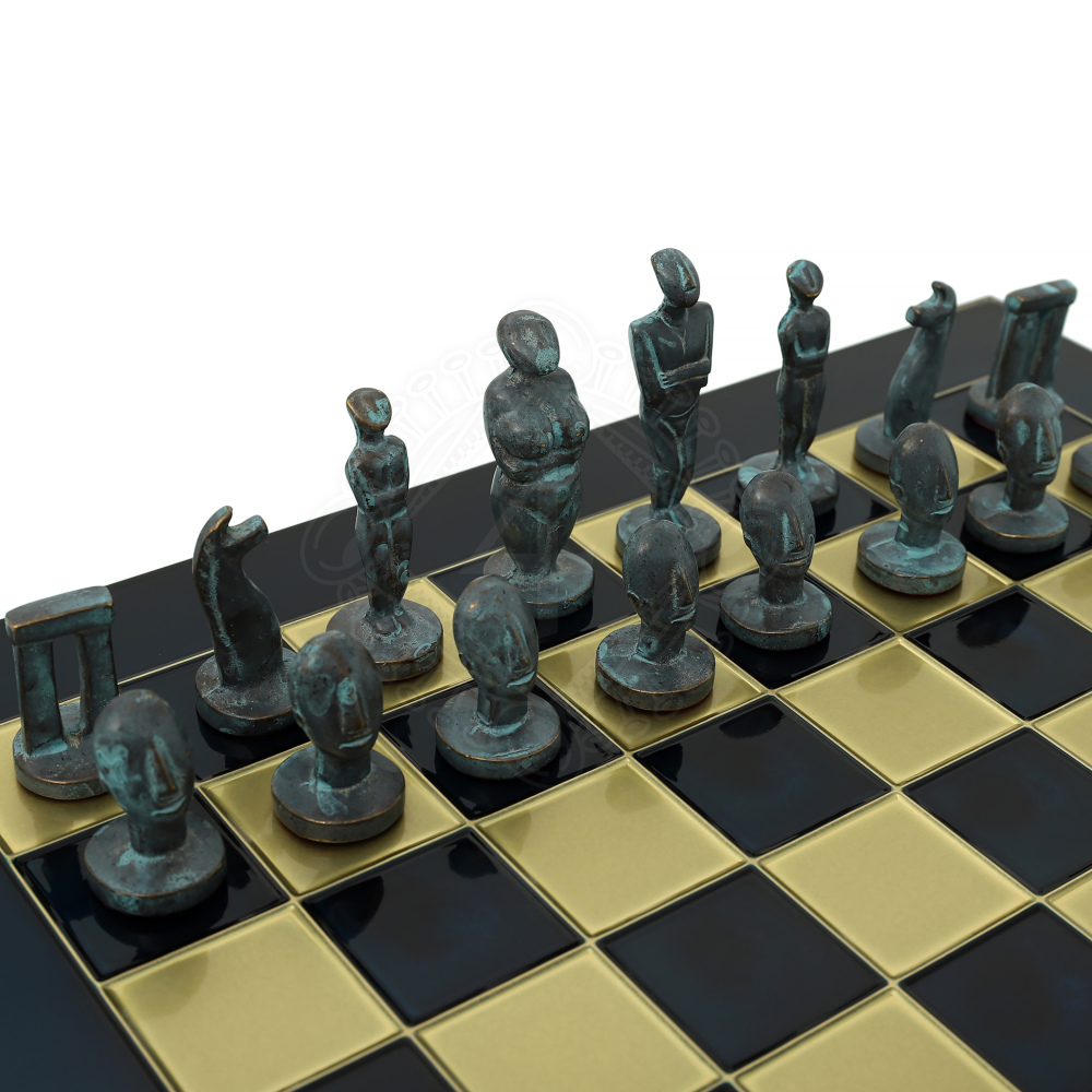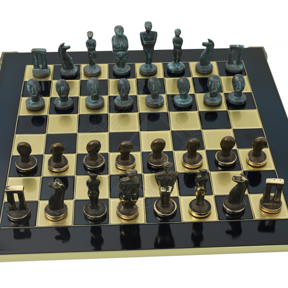 Die kykladische Zivilisation ist die älteste in Europa und blühte im 3. Jahrtausend v. Chr. in der Ägäis auf. Ihre Marmorkunst bestand aus stark stilisierten Darstellungen menschlicher Formen mit minimalen geometrischen Linien, was ihnen eine verblüffende Ähnlichkeit mit der heutigen modernen Kunst verleiht. Der König stellt eine starke männliche Figur mit minimal breiten Schultern dar, während das Idol der Dame dem bedeutendsten Abschnitt im Leben einer Frau gewidmet ist: der Schwangerschaft. Die Läufer-Figur hat Hinweislinien mit Händen unter der Brust und zusammengefügten Beinen. Der Springer ist ein Pferd aus dem Troja-Krieg, das auf dem Basrelief einer Vase auf der Insel Mykonos zu finden ist. Das Schloss ist eine Nachbildung des massiven, 2500 Jahre alten Tempeleingangs aus Marmor, der immer noch das Wahrzeichen der Insel Naxos ist. Schließlich ist der Bauer der Kopf des bekanntesten Marmoridols dieser Zeit.