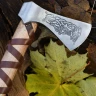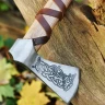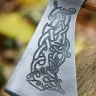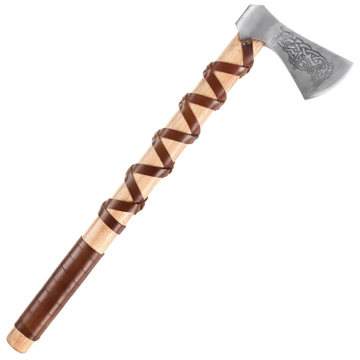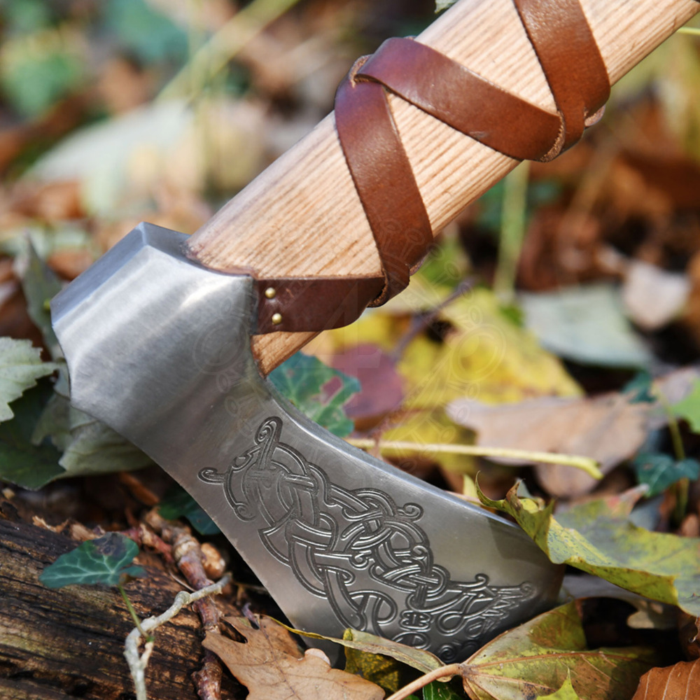 Bei der hier angebotenen Wikingeraxt entspricht die Kopfform dem Petersen Typ L. Das Blatt dieser Axt besteht aus EN45 Kohlenstoffstahl und ist mit einem nordisch anmutenden Motiv graviert. Der Axtstiel besteht aus robustem Eschenholz und ist mit Leder umwickelt.