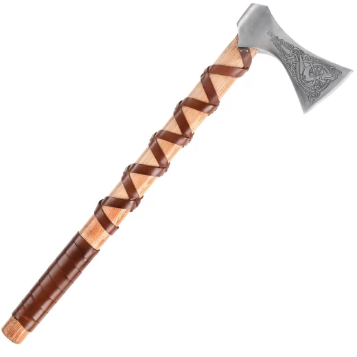 Bei der hier angebotenen Wikingeraxt entspricht die Kopfform dem Petersen Typ K. Das Blatt dieser Axt besteht aus EN45 Kohlenstoffstahl und ist mit einem nordisch anmutenden Motiv graviert. Der Axtstiel besteht aus robustem Eschenholz und ist mit Leder umwickelt.