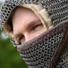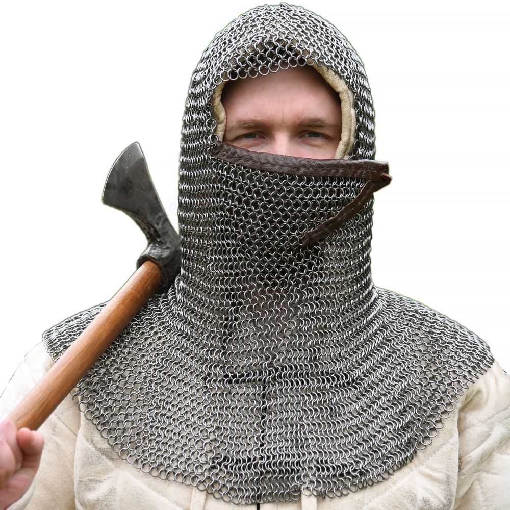 Diese Kettenhaube bedeckt komplett die Schulter und ist mit einem authentischen quadratischen Geschichtsausschnitt versehen. Zusätzlich hat die Haube einen klappbaren, dreieckigen Mundschutz an dem seitlich jeweils Lederriemen angenäht sind. Der Mundschutz, auch Kinnvaz gennant, ist innenseitig leicht gepolstert und mit Leder besetzt. Diese Art Kettenhauben waren vornehmlich im Hochmittelalter (z.B. bei Normannen, Kreuzfahrern) beliebt. Wir empfehlen das Tragen einer Bundhaube unter der Kettenhaube. Weitere Produktinformationen ...
