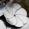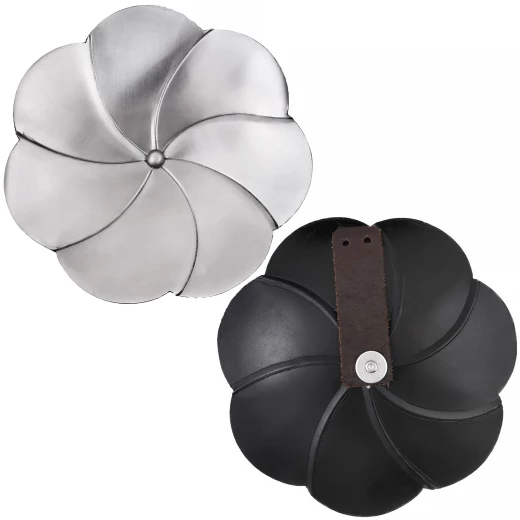 Die blumenförmigen, leicht nach innen gewölbten Schwebescheiben, die wir hier anbieten, sind aus ca. 1,2 mm starkem Stahl gefertigt. Jede Scheibe ist rückseitig zum besseren Schutz vor Korrosion geschwärzt, und zur Befestigung an einer Plattenrüstung, an Rüstungsachseln oder an einem Kettenhemd mit einem fest vernieteten, vorgestanzten Lederriemen ausgestattet (die dafür nötigen Kordeln bzw. Nesteln gehören nicht zum Lieferumfang).