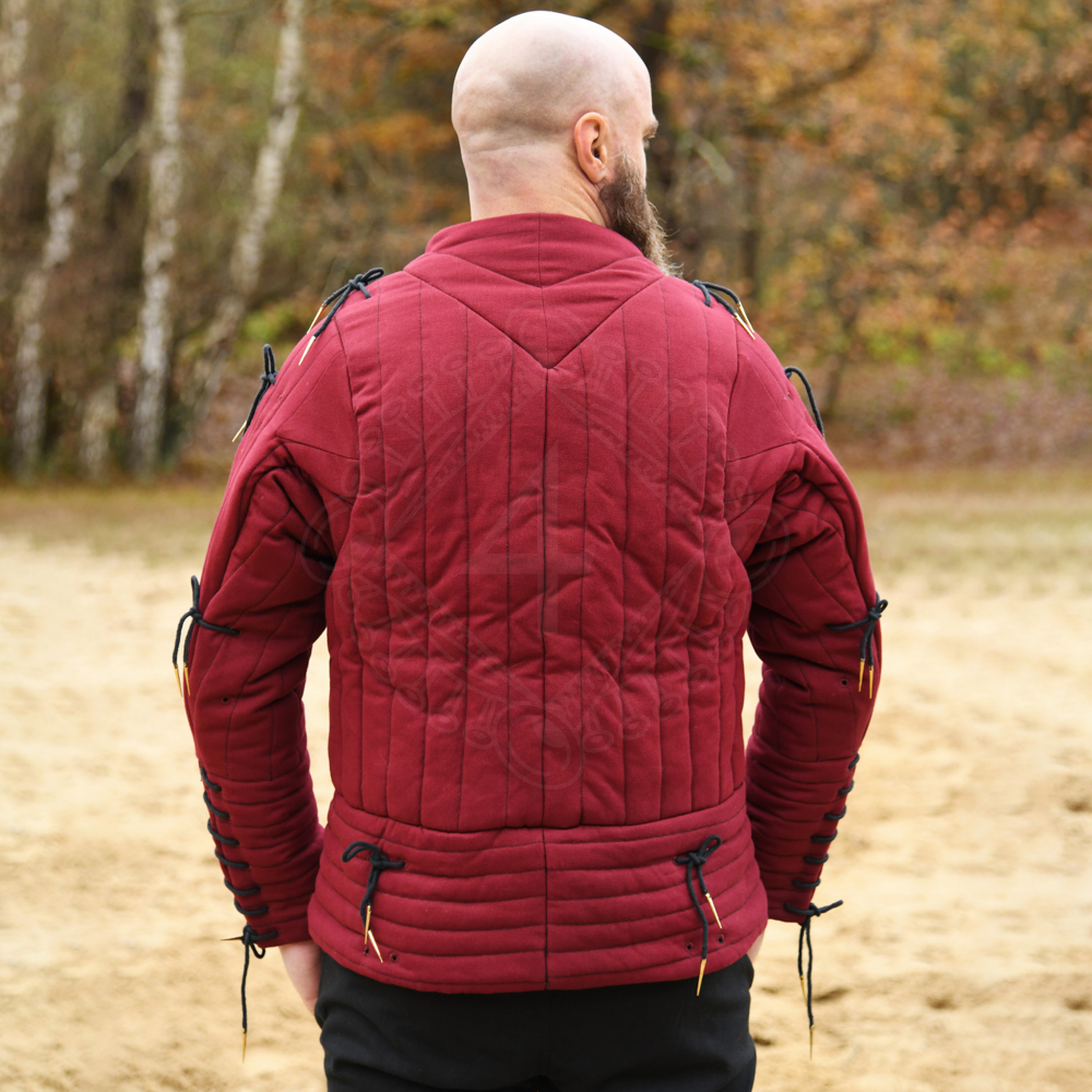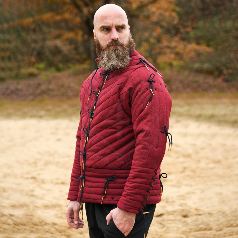 Ein Rüstwams auch Gambeson, Pourpoint oder Aketon genannt, ist nahezu unabdingbar für den Frei- und Schaukampf. Das gepolsterte Wams wurde im Spätmittelalter unter Plattenrüstung getragen und zeichnet sich durch seine kurze und körperbetone Schnittführung aus. Er erhöhte den Tragekomfort der Ritterrüstung und konnte zudem gegnerische Schläge abdämpfen und verminderte somit die Gefahr von Verletzungen.